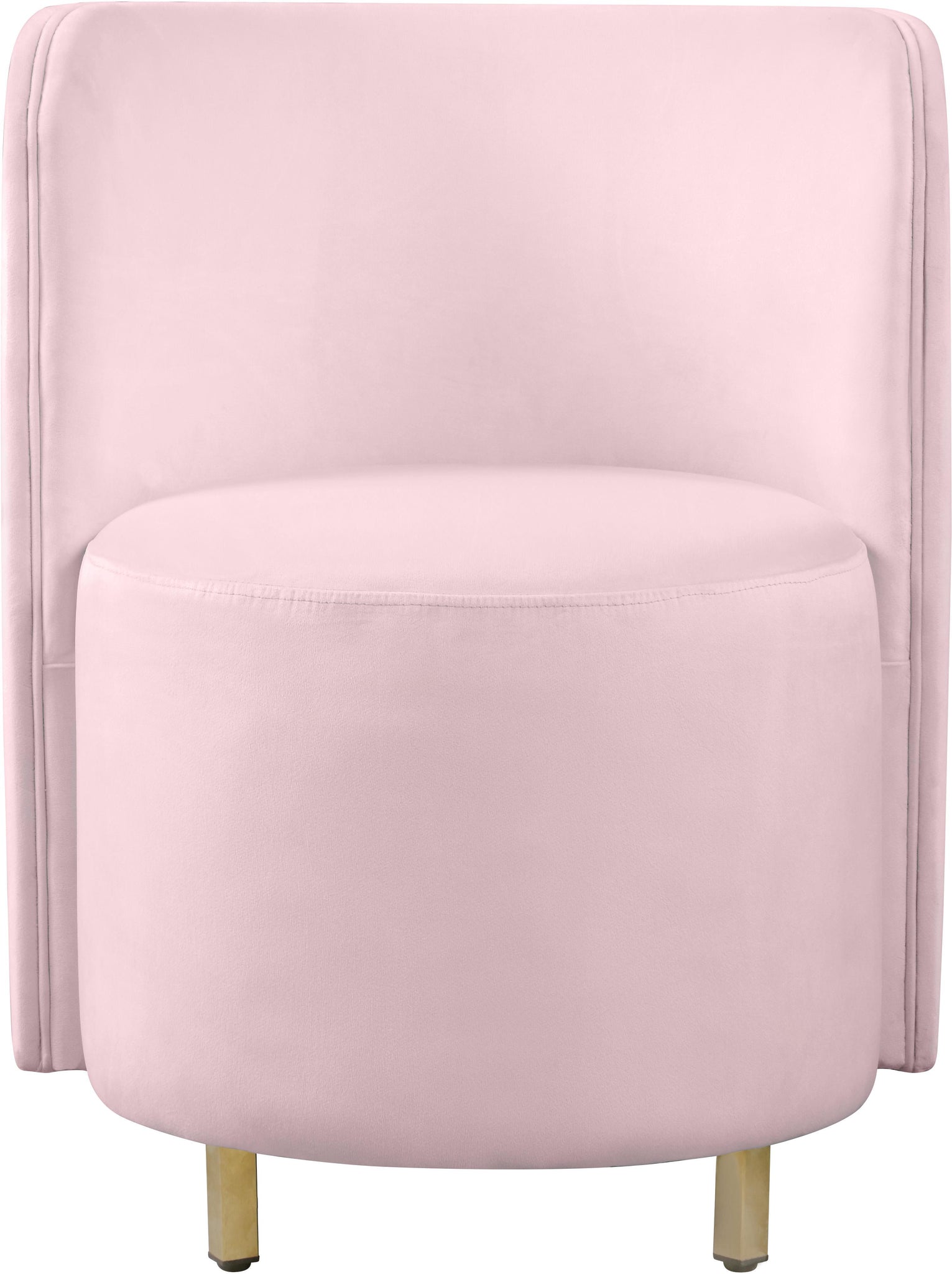 Create an envious look in your living room, parlor, bedroom or boudoir with this Rotunda velvet chair. This svelte little chair features a glamourous Hollywood vibe with its floor-length back and barrel design. The soft pink velvet upholstery lends it an added upscale feel, and the gold metal legs round out its contemporary panache. A wooden frame makes the chair a sturdy addition to any room.