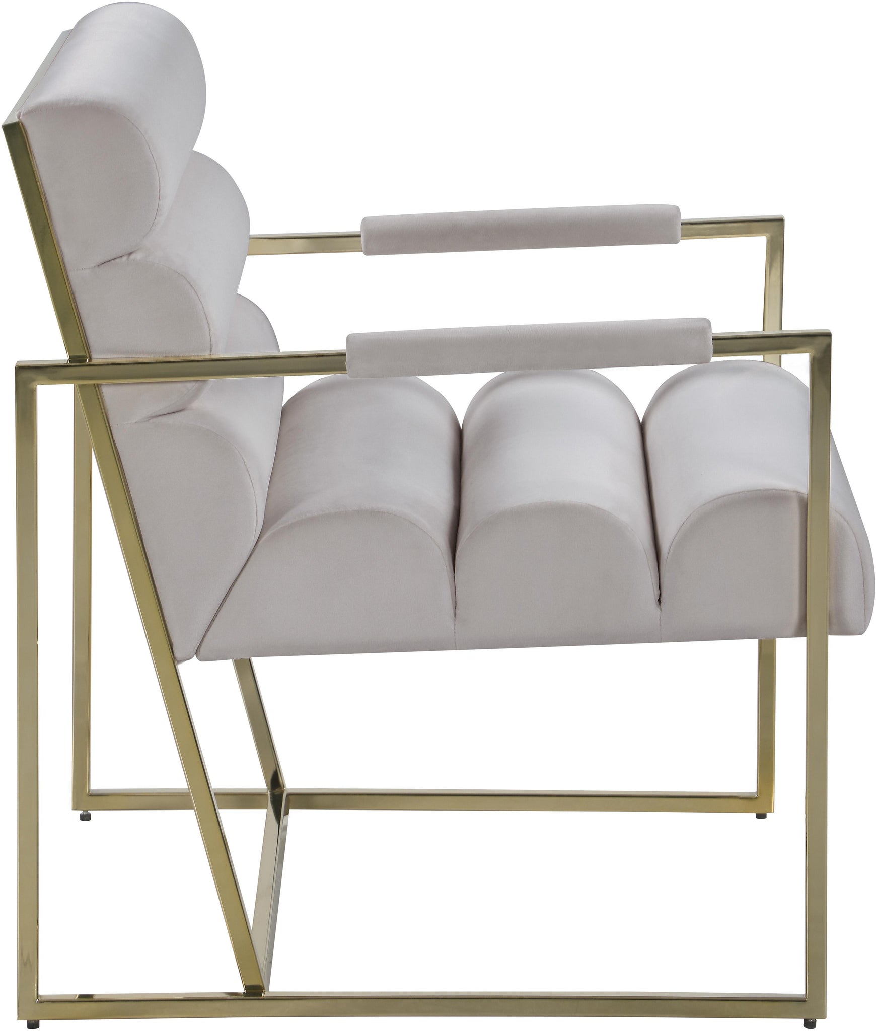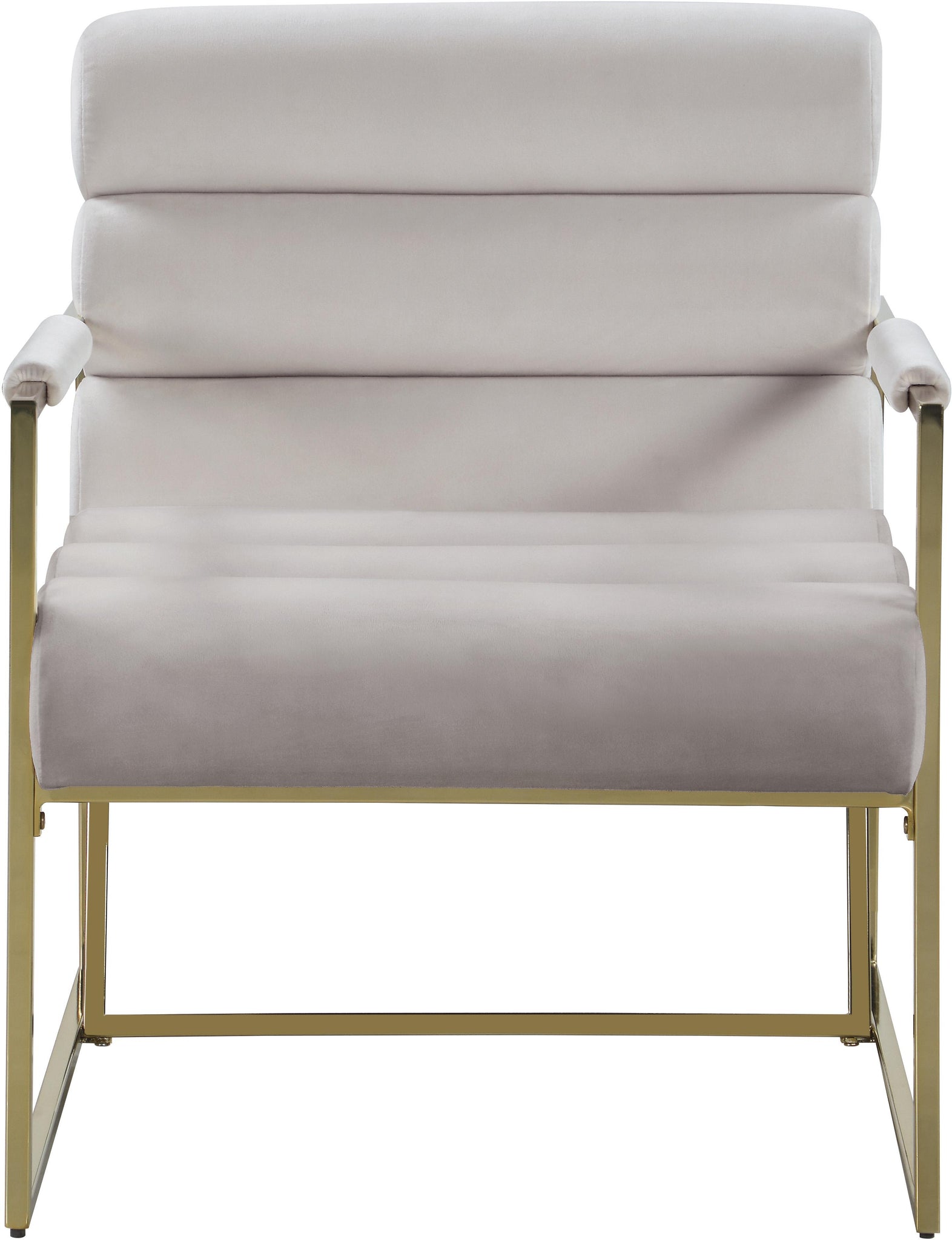 This Wayne velvet accent chair is a fitting addition to any contemporary interior space. Lovely soft cream velvet feels sleek and chic to the touch, ensuring thatyou'rere seated in total comfort. Deep channel tufting along the back and seat of the chair and its padded arms add to its comfort potential. The chair���s gold iron frame adds to its contemporary design and lends it the sturdiness needed for years of beautiful use.