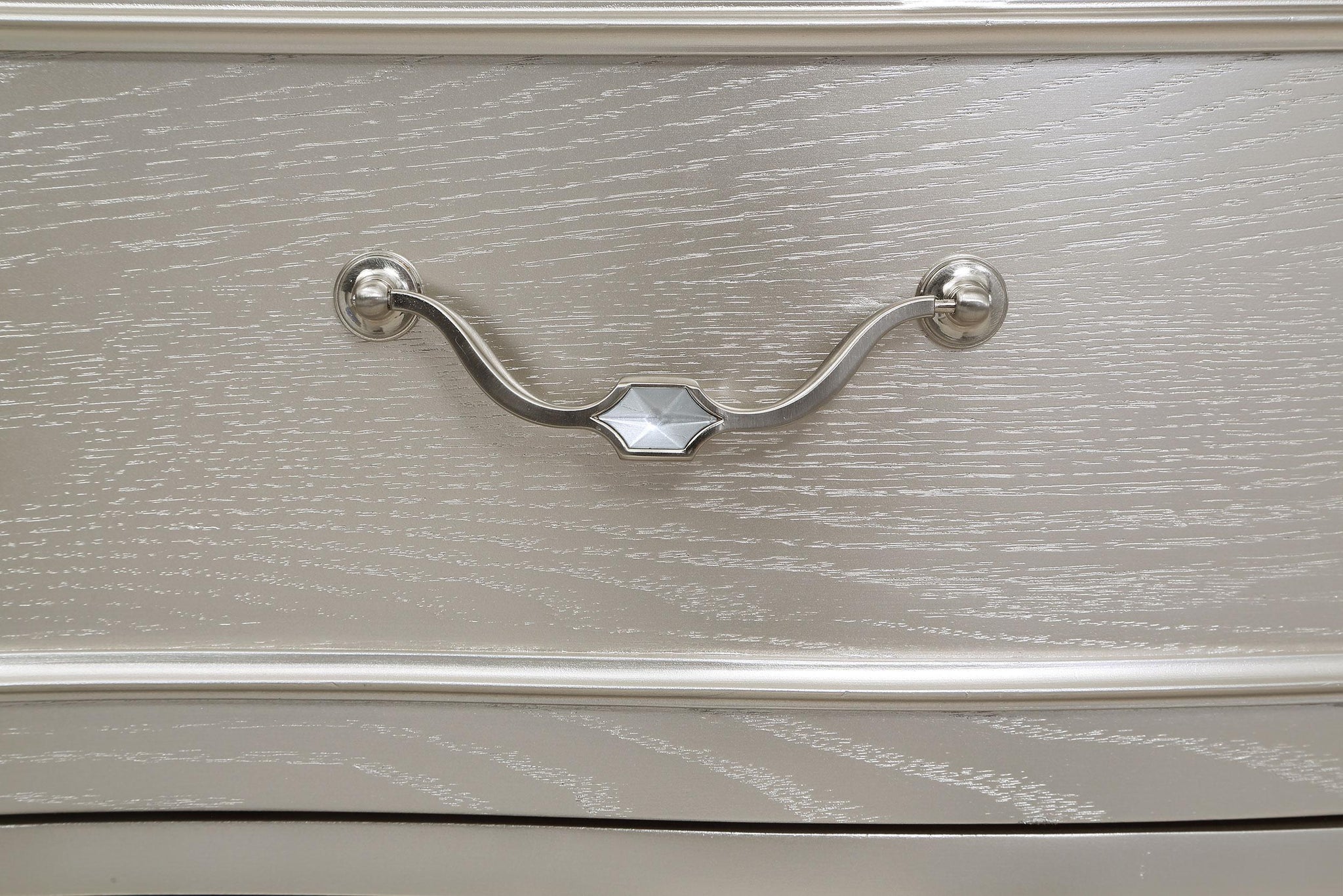 Completely reimagine your bedroom with the glamorous vibes of a four-piece modern bedroom set. Designed to make a statement, the set centers on a gorgeous silver oak finish bed complete with ivory upholstery on the head and footboards. Touch operated LED strip lighting adds ambiance to the headboard, while drawers in the side rails of the bed increase storage in your bedroom. The set includes a nightstand with a built in USB port for easy charging, and decorative curves and classic hanging hardware enhance the look with regal elegance. A nine-drawer dresser with felt lined top drawers and a lighted mirror completes the set, offering abundant storage and organization and a sophisticated look and feel.
