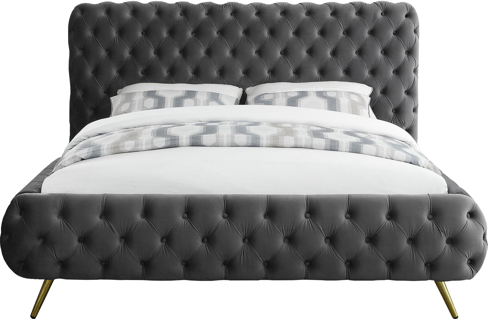 Surround yourself in modern luxury when you add this Delano Grey Velvet Queen Bed to your bedroom oasis. Sumptuous by design, this bed features all-over button tufting for a look that is nothing short of stunning. This dimensional bed features a heavily padded headboard and side rails, each covered in magnificent-to-the-touch grey velvet for a look that's upscale and simply divine. Metal legs on this bed allow easy clearance for vacuuming, and the bed uses just a mattress, so there's no need for a box spring or foundation, which only adds to its sleek look.