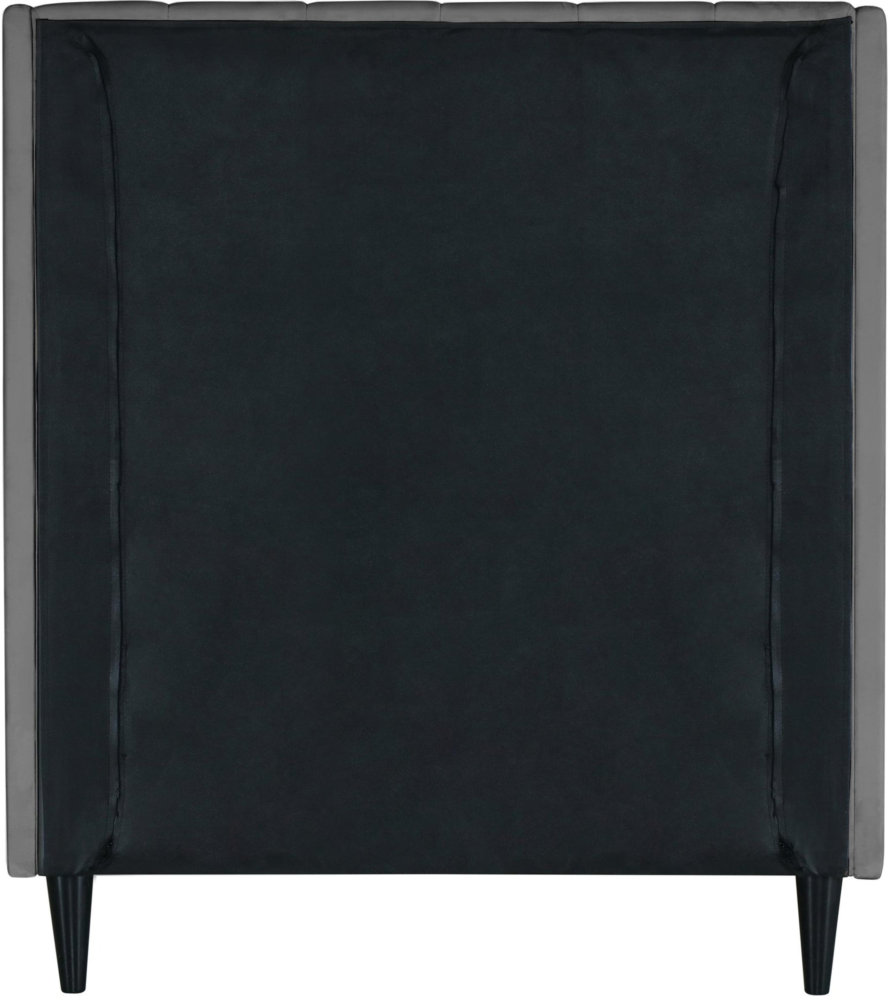 Snuggle up to a pet or other loved one in this richly upholstered Eva grey velvet twin size bed for the ultimate in rest and relaxation. The wing back headboard has cushioned vertical deep channel tufting, and both the side rails and footboard are upholstered too for your comfort. Tapered black wood legs match the upholstery and support this contemporary bed, elevating it sufficiently that you can store items underneath.