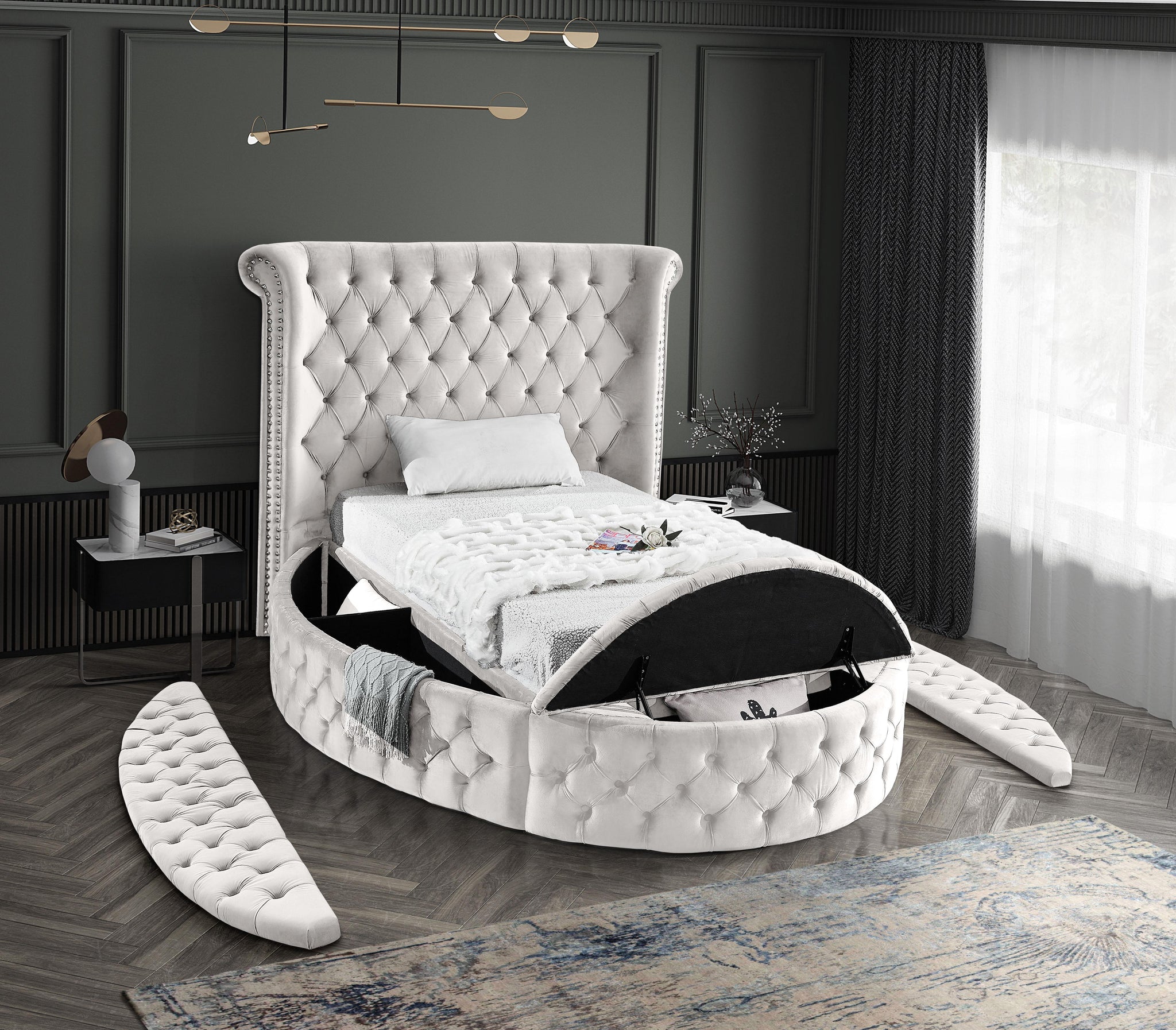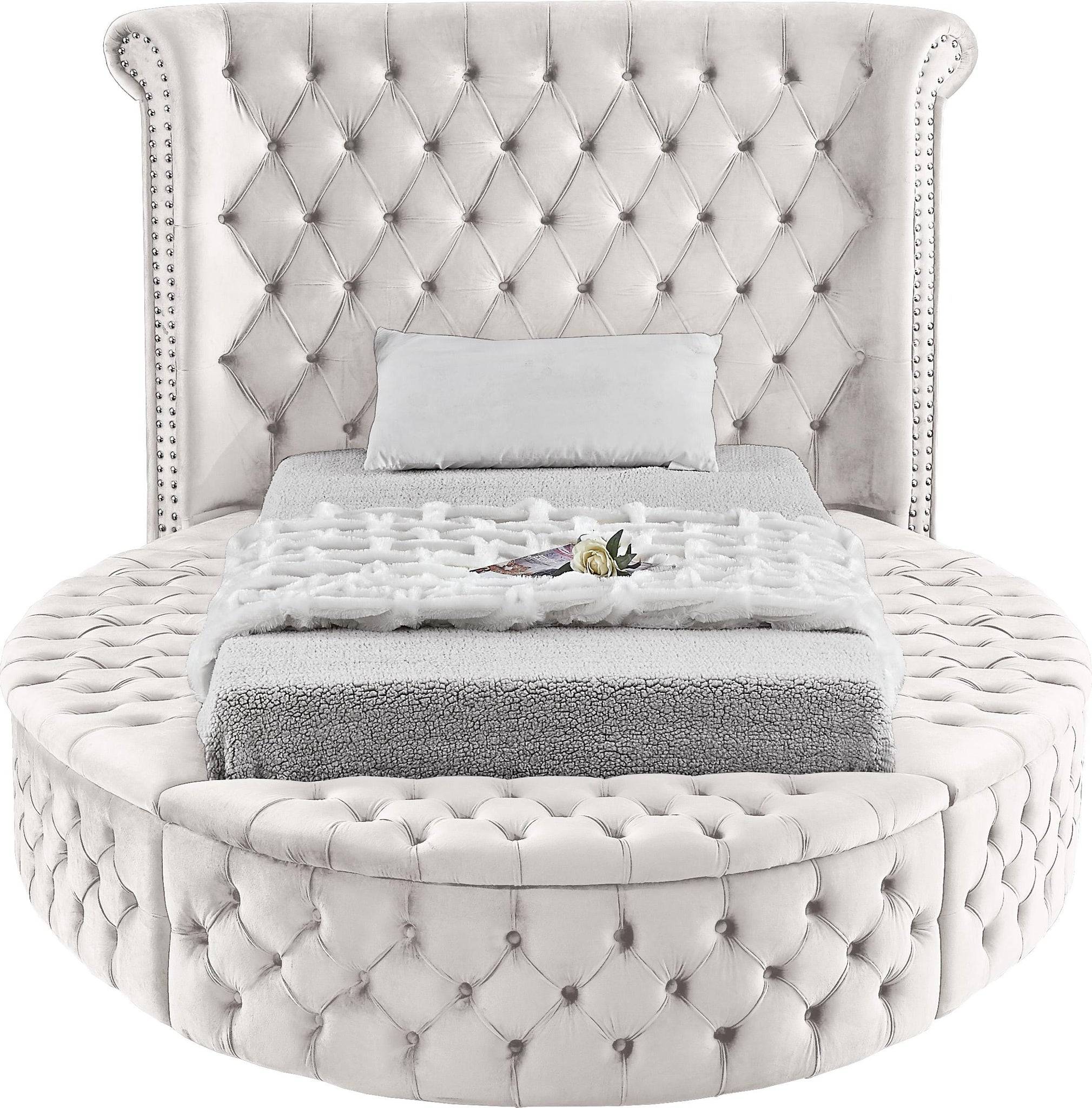 Marvel at the remarkable beauty and graceful lines of this round Luxus cream velvet twin size bed. The headboard, footboard and side rails are all adorned with deep button tufting, and there is nailhead trim on both sides of the tall headboard. The footboard and side rails all contain ample storage and seating, making it easy to sit down in comfort so you can put on your pants or shoes.