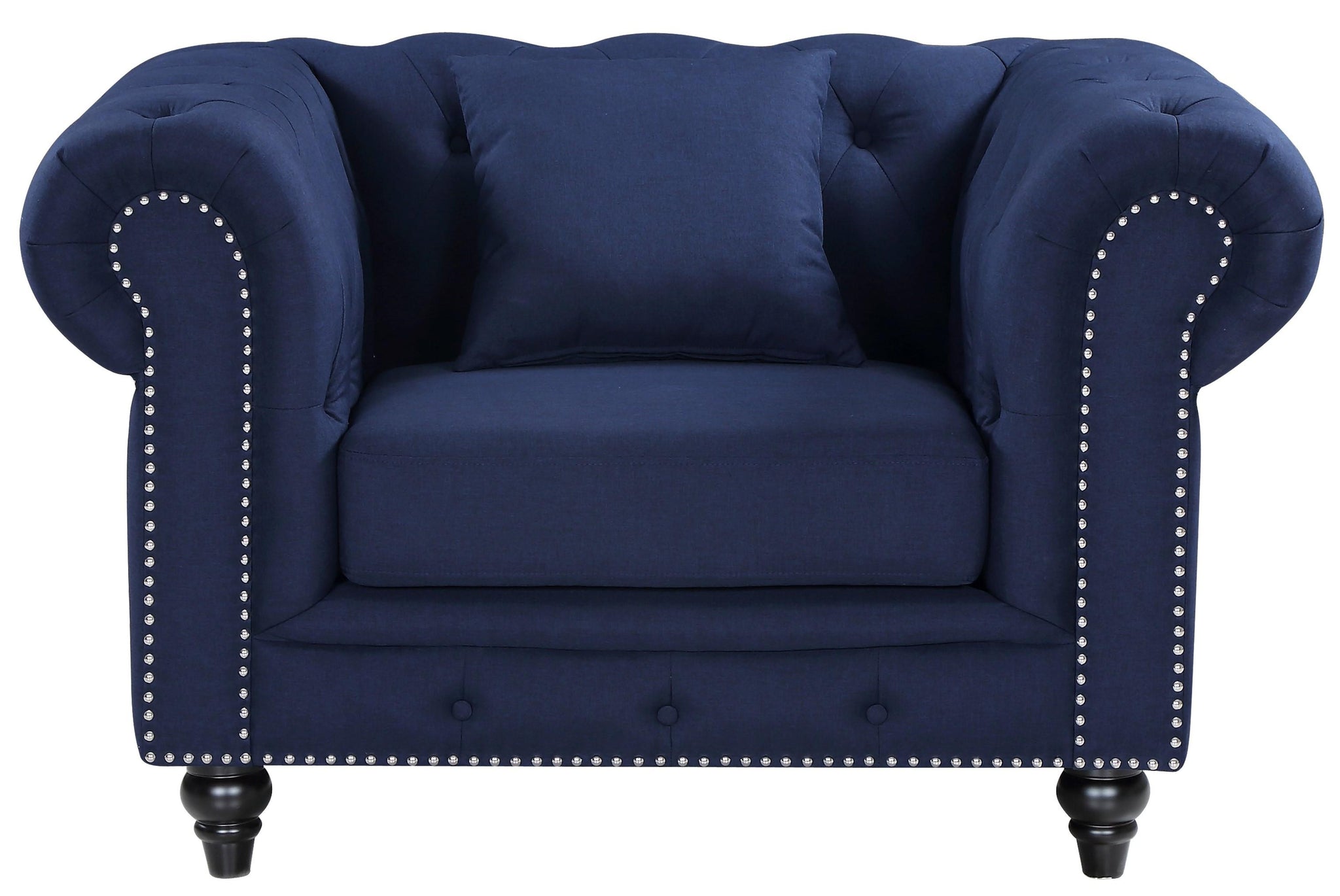 Elegant and eye-catching, the stunning Chesterfield Living Room from Meridian Furniture is the perfect addition to any space. Rich Linen covers the plush, comfortable seat, padded with high-density foam and modern tufted design. Strength and beauty is guaranteed with a solid wood frame and legs. Features a nail head design on the arms and includes matching throw pillows.
