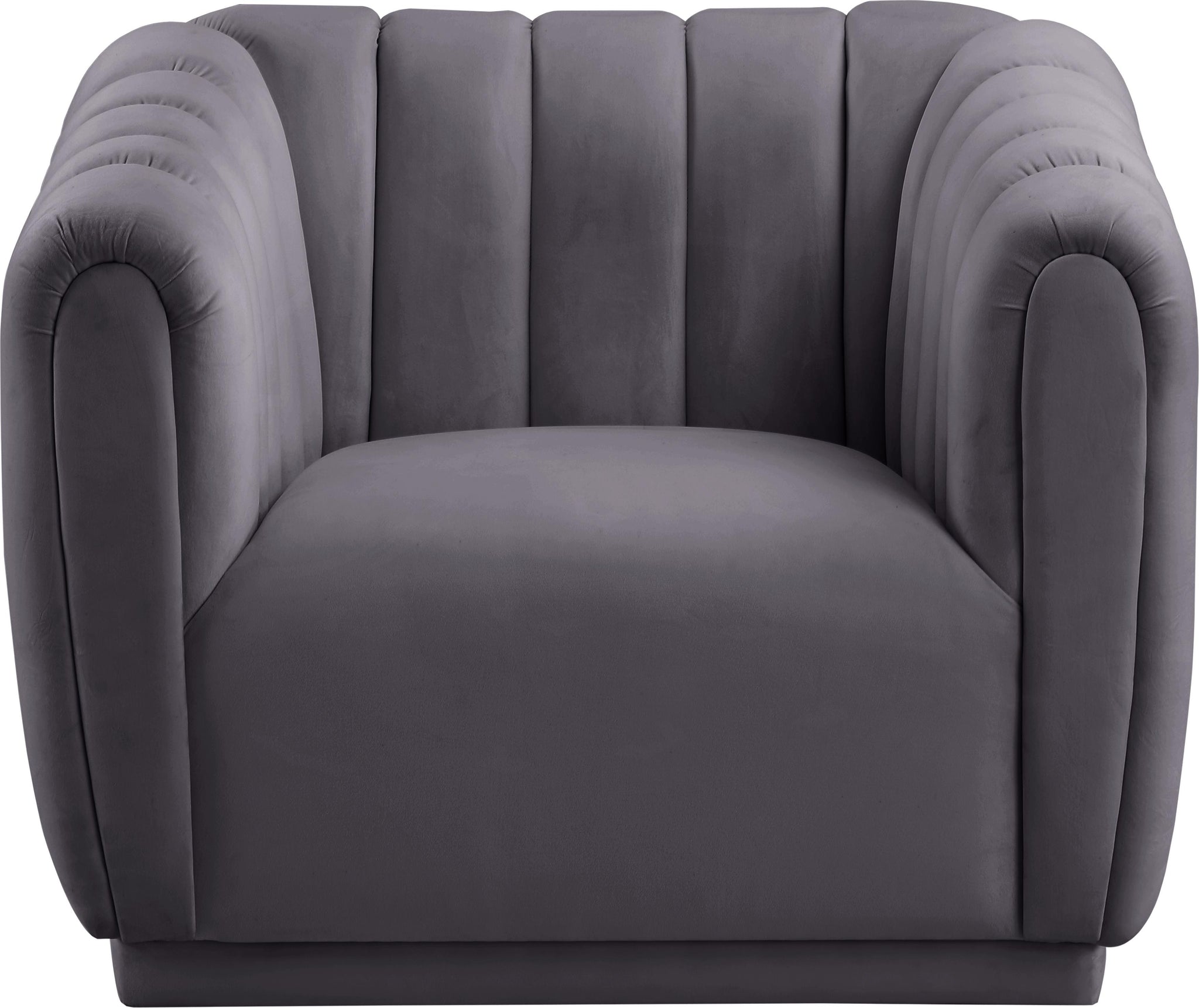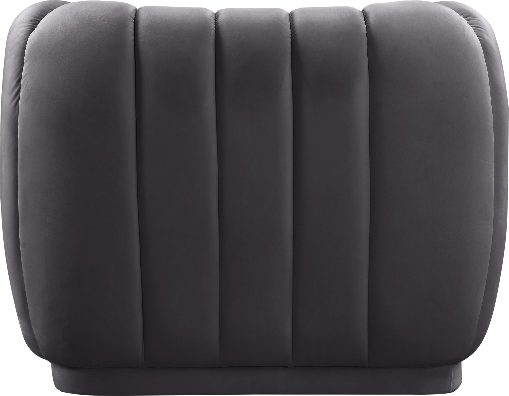 Casual meets elegant in the design of this Dixie velvet chair. Relax, unwind, and take a load off whileyou'rere kicked back in this handsome seating option. Deep channel tufting adds an upscale touch to the unit���s soft grey velvet upholstery while giving it a dimensional look. Pair this piece with other items in the Dixie collection for a complete and seamless look in the living room or den.