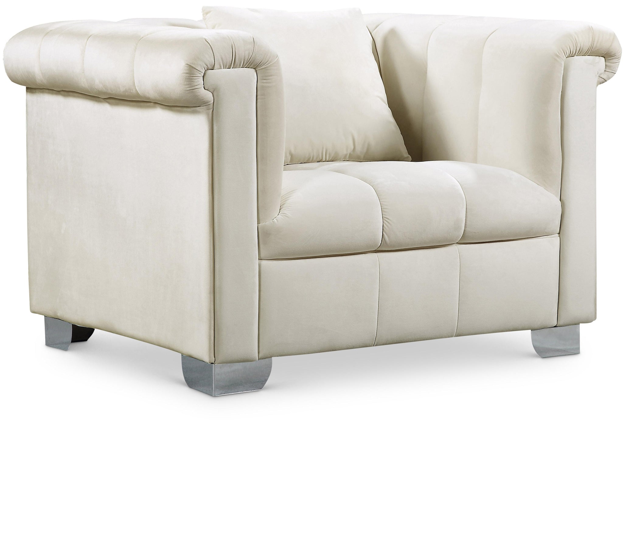 The Kayla Collection by Meridian Furniture. Features beautifully designed velvet upholstery with custom chrome legs. This collection is guaranteed to be the highlight of any home. Throw pillows included.