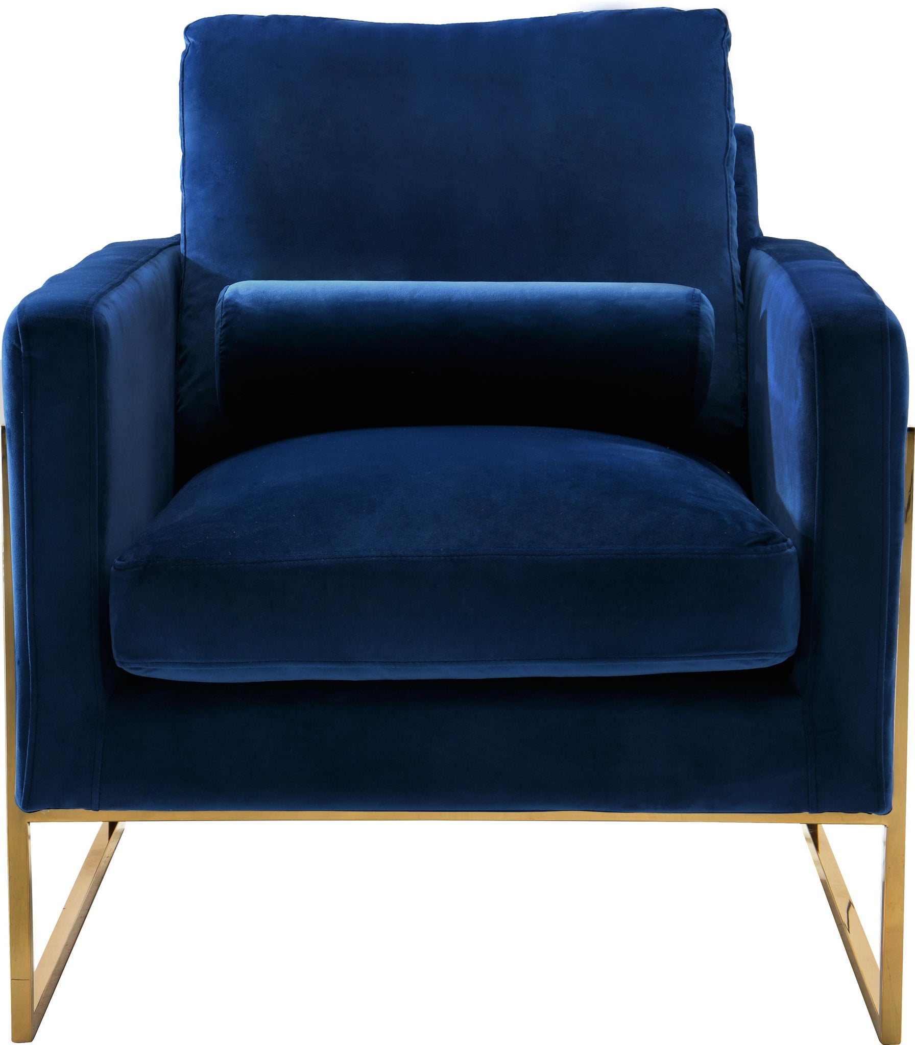 Seat guests in complete luxury on the Mila Navy Velvet Chair. The bold navy color makes a statement in your space, and the gold stainless steel frame ensures sturdy support while you relax or take a nap. It comes with two throw pillows that cradle your sides as you sit, elevating its comfort level. Lots of clearance beneath this sofa makes cleaning and vacuuming a breeze. Buy it alone or pair it with the matching sofa or loveseat!