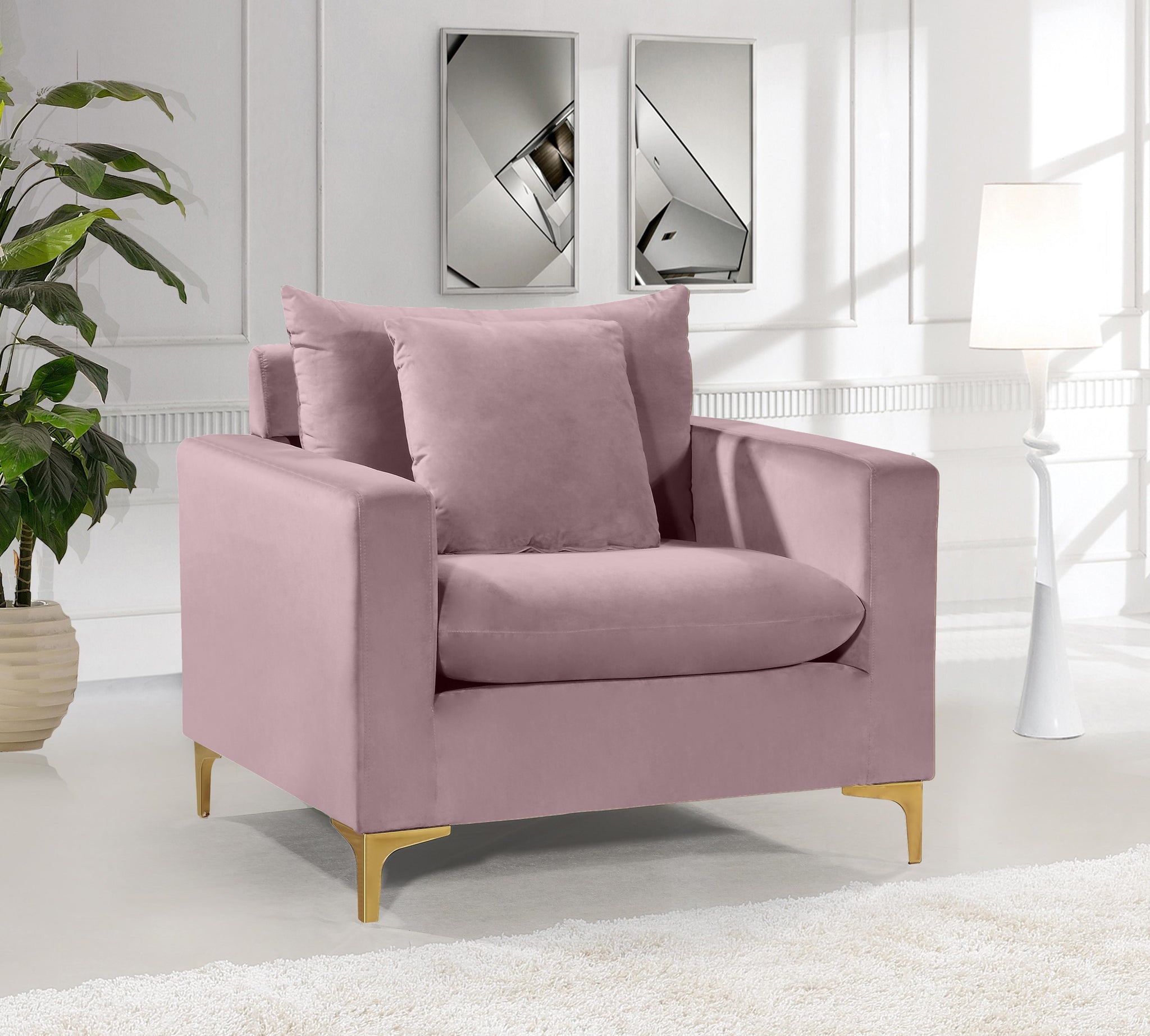Curl up with a good book from the welcoming confines of this Naomi Pink Velvet Chair. The color of this chair adds a bold touch to your decor and shakes up otherwise neutral color schemes. Plush velvet material feels cozy and comfortable against your skin, while deep seat cushions provide lots of room for you to stretch your legs. This chair comes with both gold and chrome legs, so you can customize its look to meet your decor plans. Pillows are included for added homey warmth and comfort.