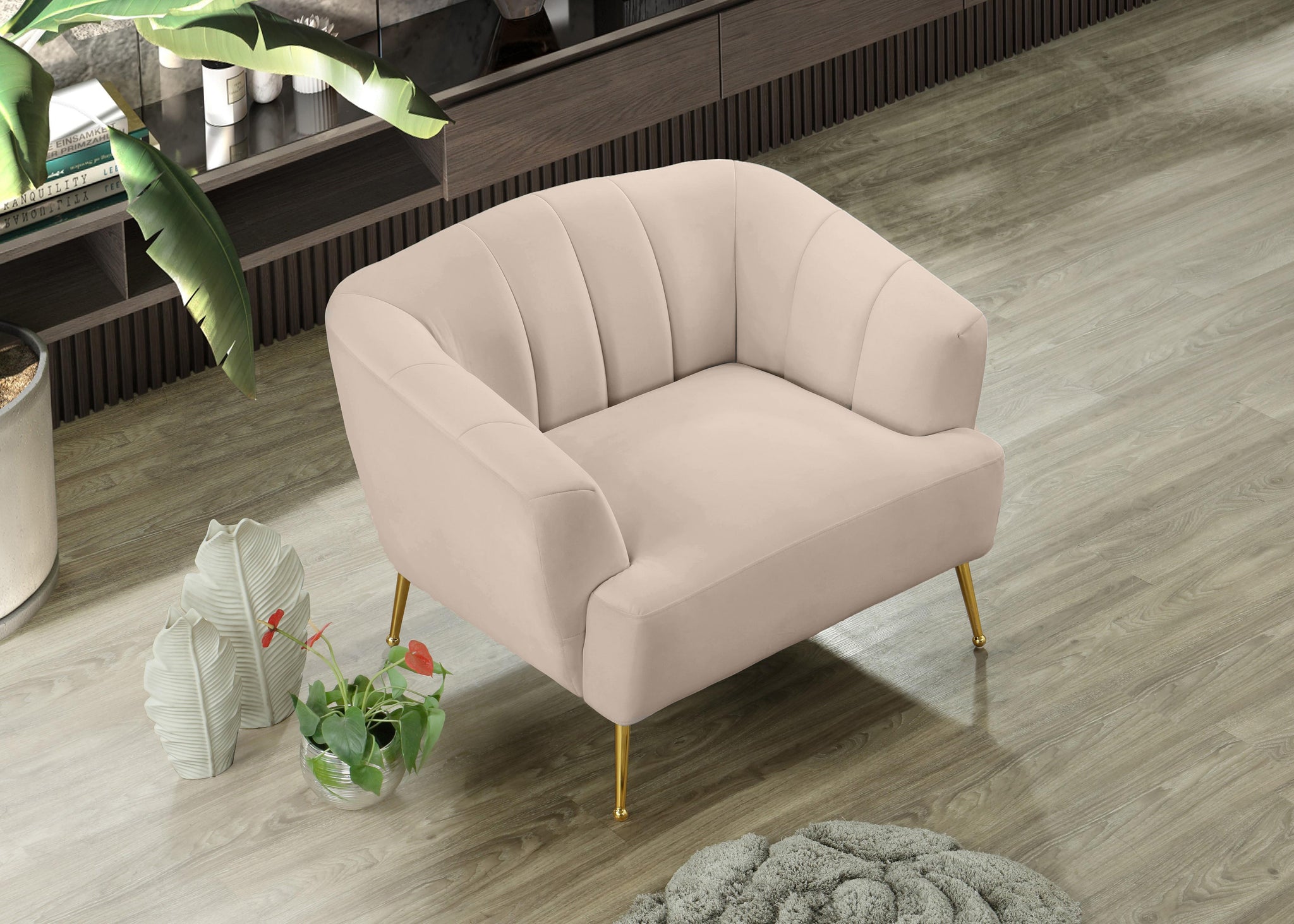 Dress up your living room space with this Tori Velvet Chair. This plush chair features fun pink velvet upholstery that covers every square inch, adding a sumptuous and svelte look to your room. The gold legs with a ball design on the foot adds to the elegant look of this pretty chair, and deep channel tufting adds loft to the back and arms for a lavish feel when you sit down to relax and unwind at day���s end.