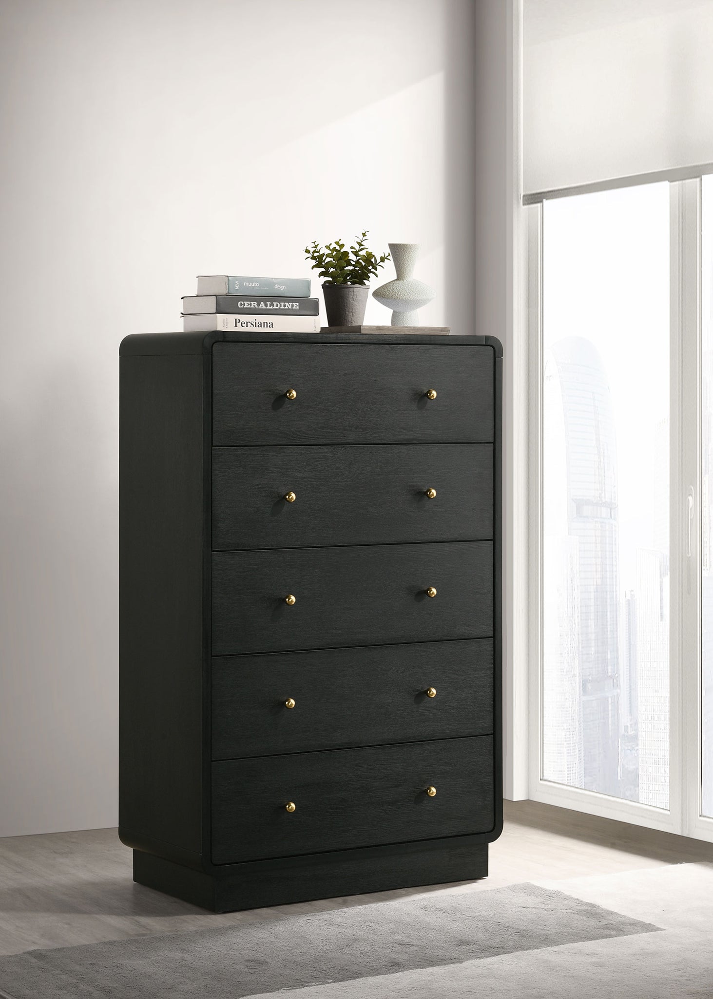 Create a dedicated space for clothing and accessory storage with this modern five-drawer chest. Its sophisticated presentation is complemented with a black finish over durable melamine surfaces, resisting damage to maintain its fresh, clean aesthetics. Each drawer front is dotted with a pair of ball knobs, offering seamless performance and a refined, glam touch of character. The chest features a rounded silhouette, softening the dark black finish, while adding to its modern appeal. Add art to its roomy top to create a truly eye-catching accent piece in your bedroom.