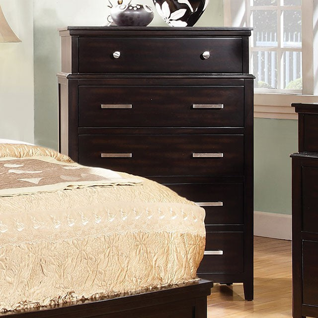 Available in espresso, this contemporary design case goods add an extra creative flair. The tiered design makes this chest a one-of-a-kind piece for those looking to spice up their bedroom.
