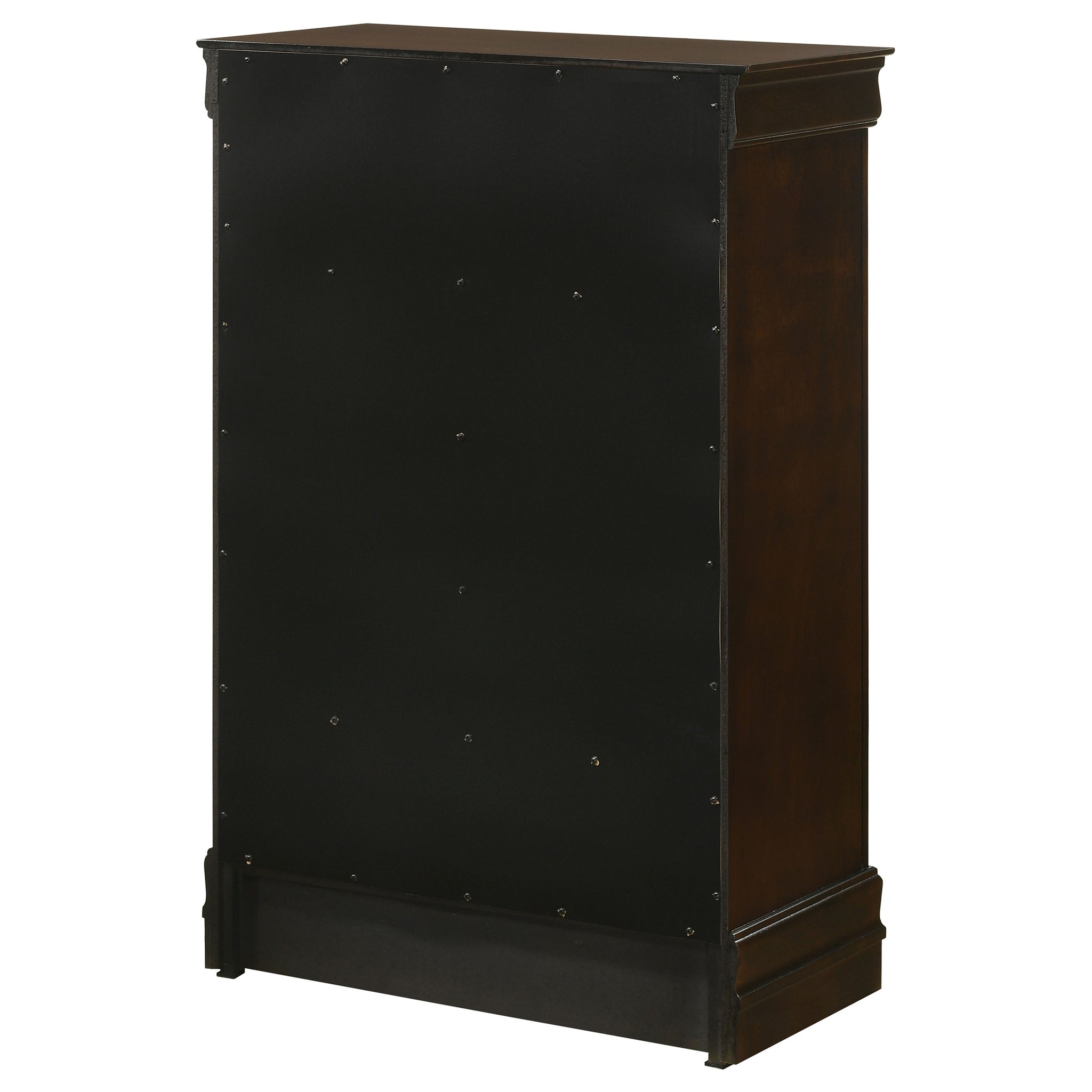Add depth to a traditional decor scheme with this five-drawer chest. Simple and elongated, the silhouette features wood veneer and select hardwoods. Radiate classic style and sophistication with a warm cappuccino finish. Contrasting nickel bail drawer handles are a modern upgrade. The English dovetail construction provides structure that is perfect for storing linens and extra clothing.