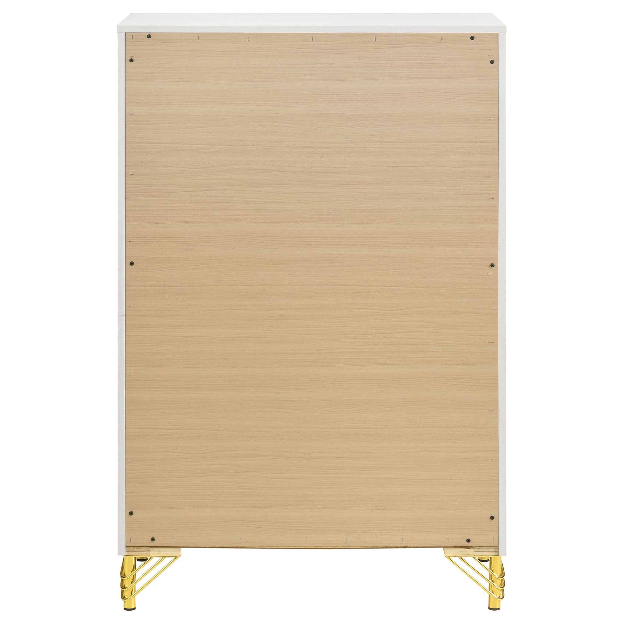Inspired vintage touches create a refined sensibility for a modern five-drawer chest. Its tall, compact profile is ideal for a dressing area, offering plenty of storage with five roomy drawers that host everything from clothing and accessories to linens and other personal effects. The chest shows off a bright white finish, complete with gleaming gold trim that adds warmth and elegance. Its long bar drawer pulls add character, while hair pin inspired legs bring retro glamour and sophistication. Add decor to the top for a personal touch in your bedroom.