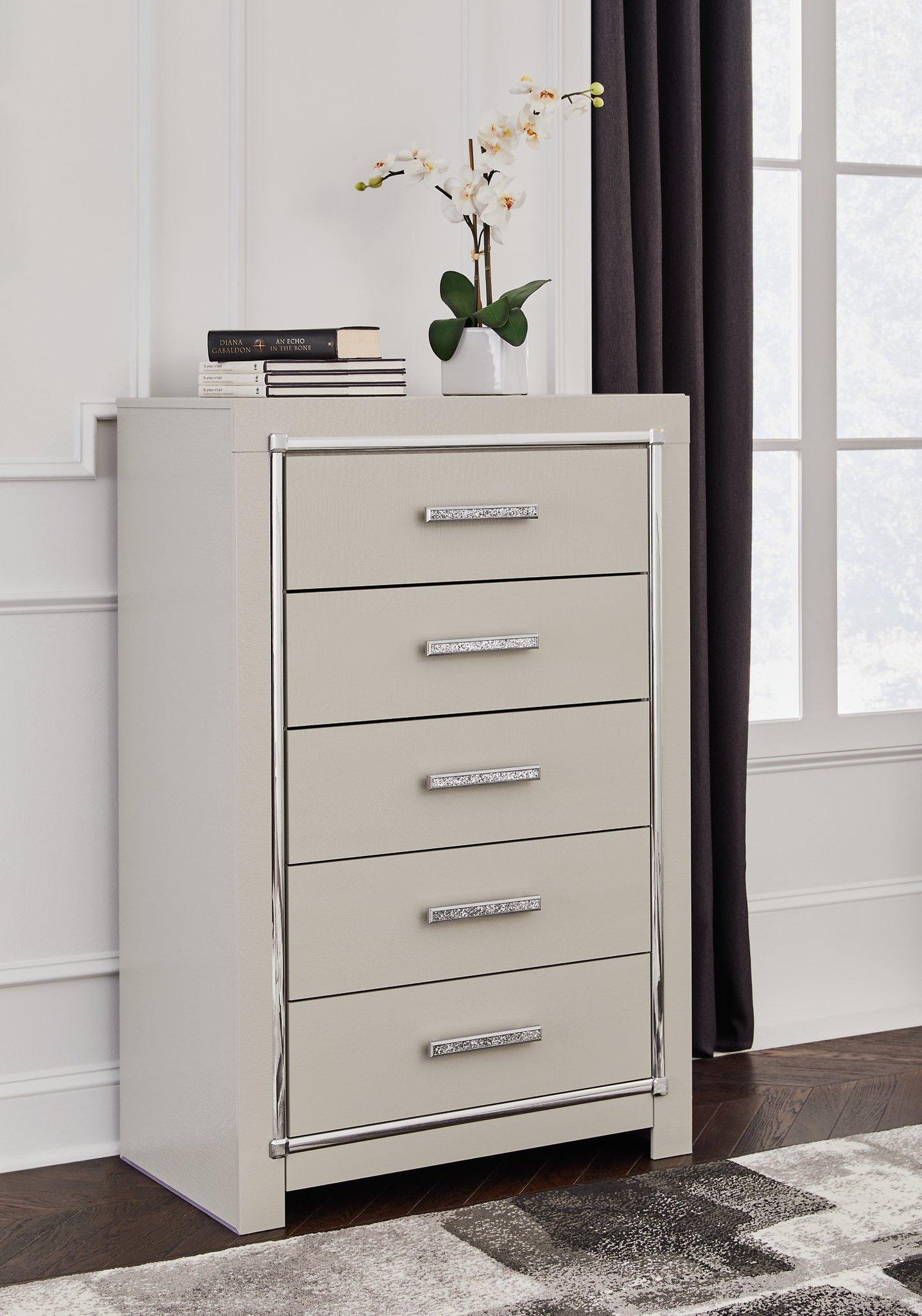 Bright, bold luxury. This chest of drawers dazzles with its attention to detail. Your love of glamorous style is reflected in its all-over faux gator in a metallic finish, exquisitely paired with faceted chrome-tone details. Complete with smooth-gliding storage drawers, it inspires you to live luxuriously every day—whether dressing up to go out or dressing down to stay in.