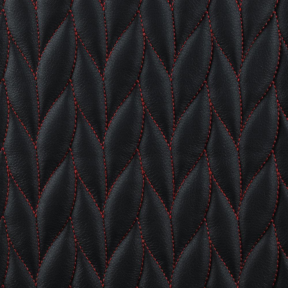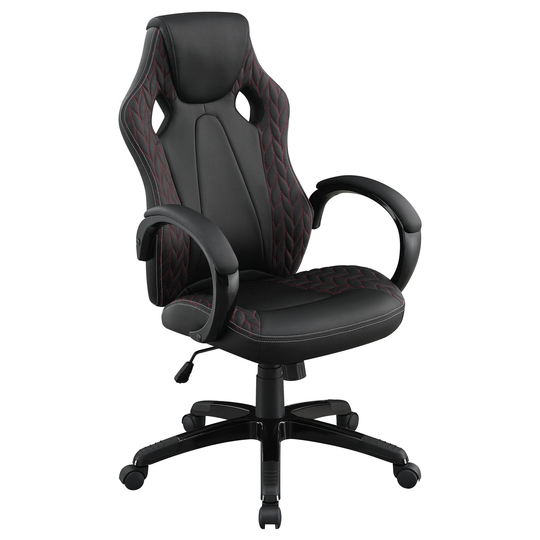 Perfect for a modern home office, this contemporary office chair is wrapped in a black leatherette that offers a bold statement piece. Accenting the black leatherette is a botanical-inspired herringbone pattern with a red stitching details, giving a subtle pop of color. Rounded padded arms provide a place to rest your elbows, while a padded headrest and seat offer long-lasting all-day support. Mounted to a rolling base with five wheels, this mobile office chair easily glides throughout the office space to retrieve items and more. In addition, this office chair can be adjusted, lifted to fit your preferable desk height.
