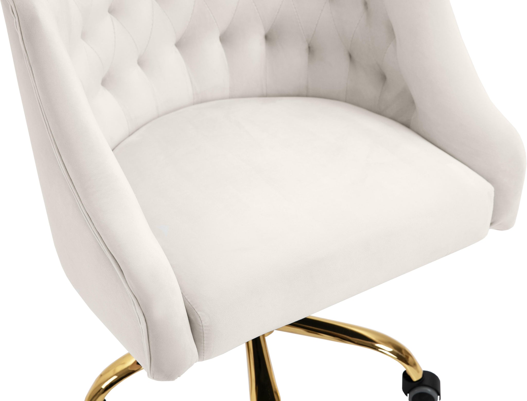 Stay cozy and comfortable at work while expressing your definitive modish tastes with this Arden Velvet Office Chair. This sumptuously appointed chair features soft cream velvet upholstery with svelte button tufting and a rich gold base, ensuring that it garners more than its fair share of oohs and aahs, no matter who���s admiring it. This contemporary office chair swivels to allow for expanded functionality, and it���s adjustable, so you can customize the chair���s position to meet your sitting preferences.