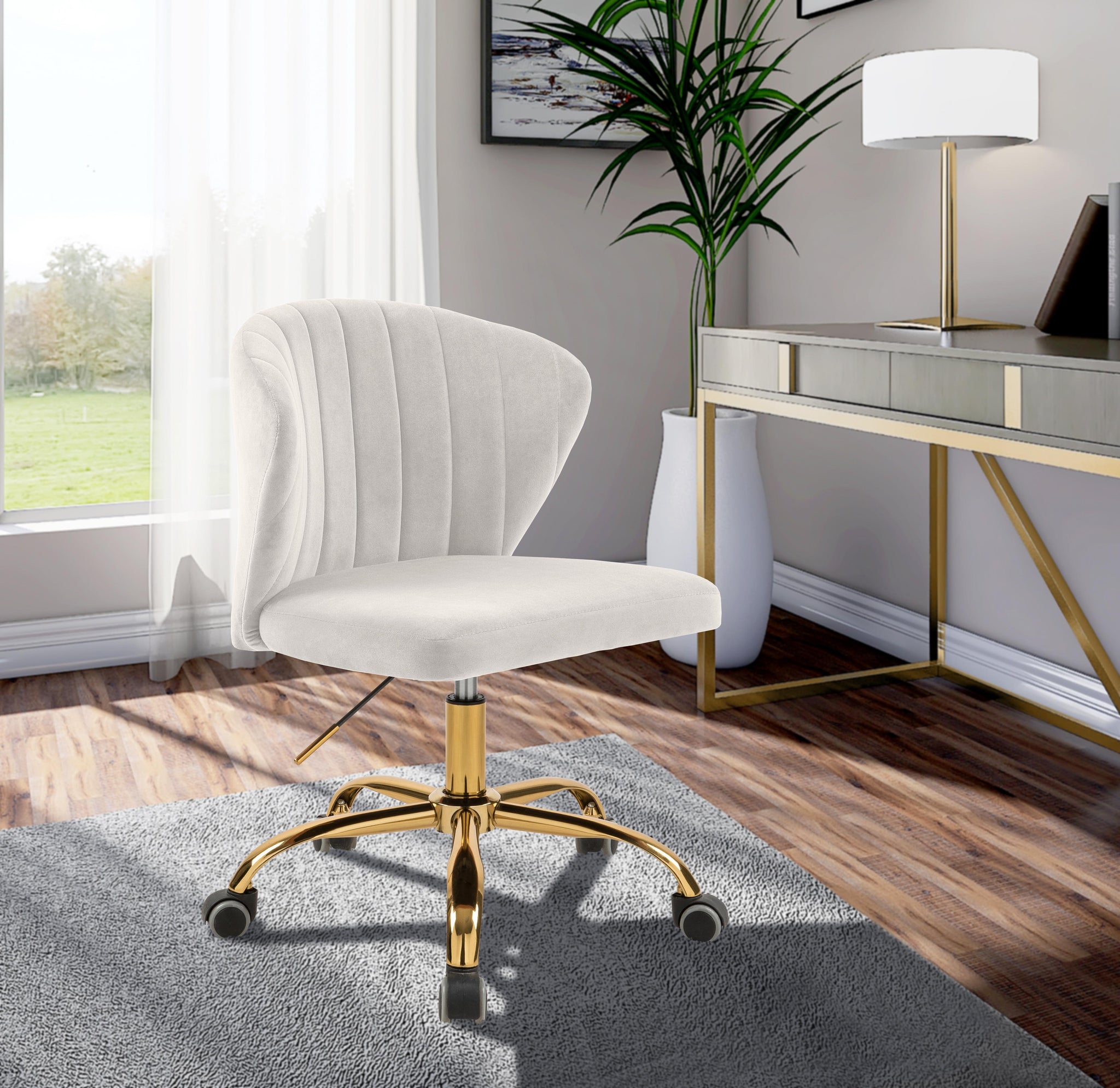 Count on the Finley Velvet Office Chair to give them something to talk about around the water cooler. This beautiful office chair has a svelte seashell-inspired back that���s channel tufted for sumptuously inviting look and added comfort to help you get through those long hours chained to your desk. Reward yourself for the VIP you are with this chair that���s upholstered in soft cream velvet that feels luxurious against the skin no matter how hard you work. The rich gold base features five casters to make it easy to roll from your workstation to the printer, and this swiveling chair���s adjustable for added comfort.