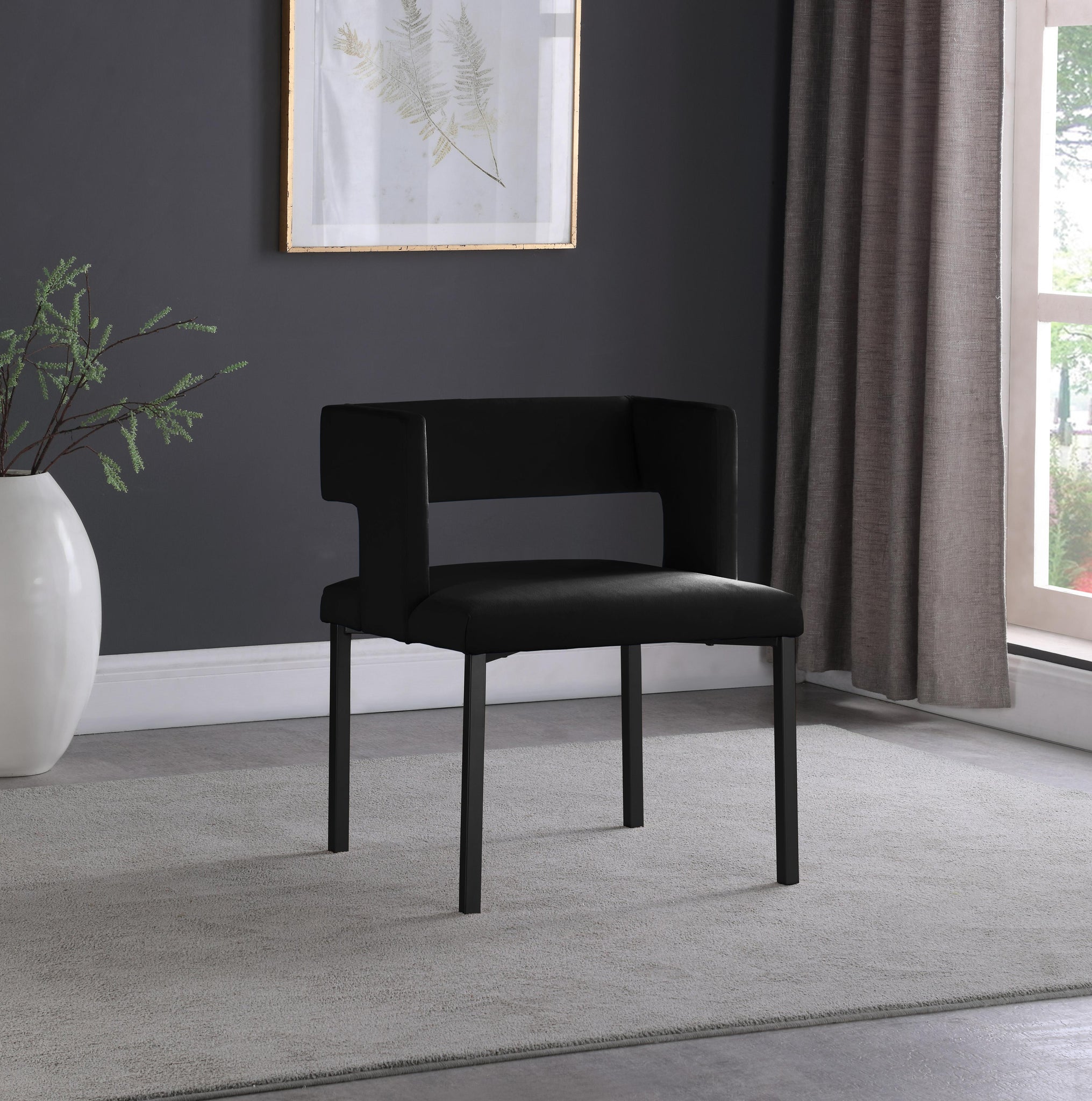 Add the Caleb black velvet dining chair to your dining room for the ultimate in comfort and style. This chair has a square seat and low back which is open at the bottom to the rear and on the sides. Four brushed gold square iron legs provide support and stability, while the chair's soft velvet and cushioning offer an air of luxury. Several available tables make a perfect companion to this contemporary piece.