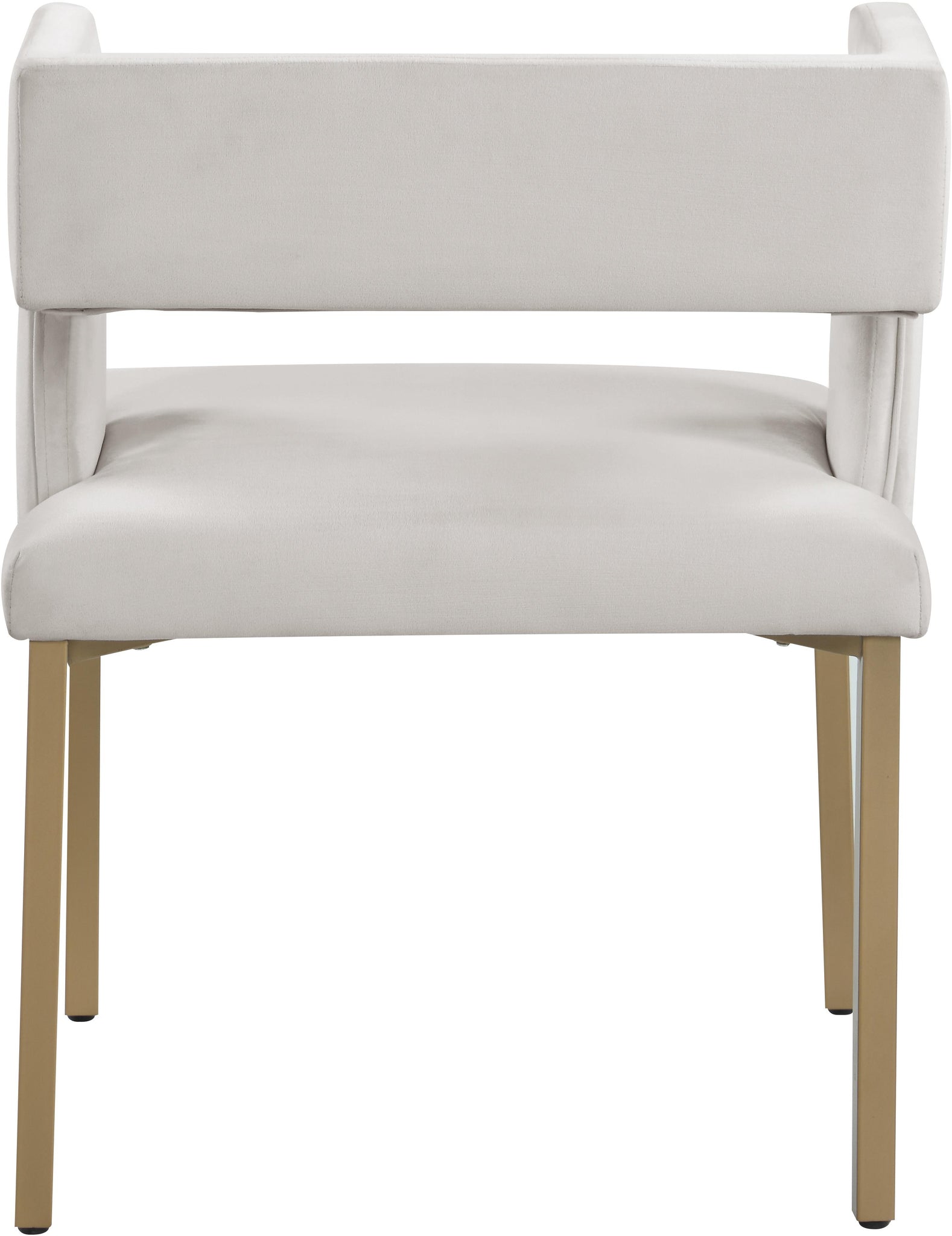 Add the Caleb cream velvet dining chair to your dining room for the ultimate in comfort and style. This chair has a square seat and low back which is open at the bottom to the rear and on the sides. Four brushed gold square iron legs provide support and stability, while the chair's soft velvet and cushioning offer an air of luxury. Several available tables make a perfect companion to this contemporary piece.