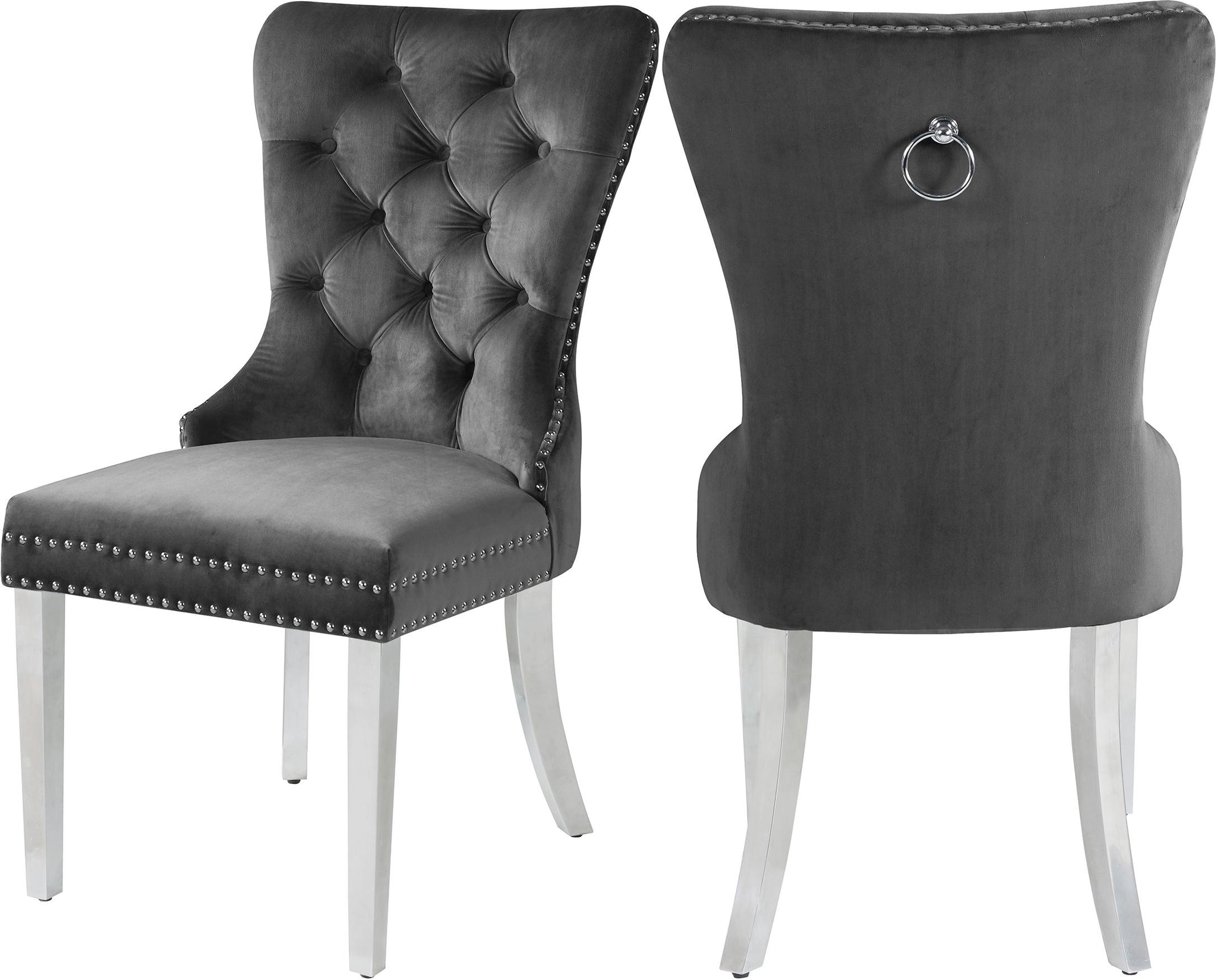Transform your living space into a chic haven with this Carmen Grey Velvet Dining Chair. This eye-catching high-back chair offers plenty of back support, while its luxurious grey velvet upholstery and deep button tufting provides a soft texture, enabling you to recline in comfort and elegance. Chrome metal legs provide sturdy, durable support, and a matching chrome knocker on the chair's back gives it a unique, stylish touch that adds that extra bit of oomph to your contemporary home.