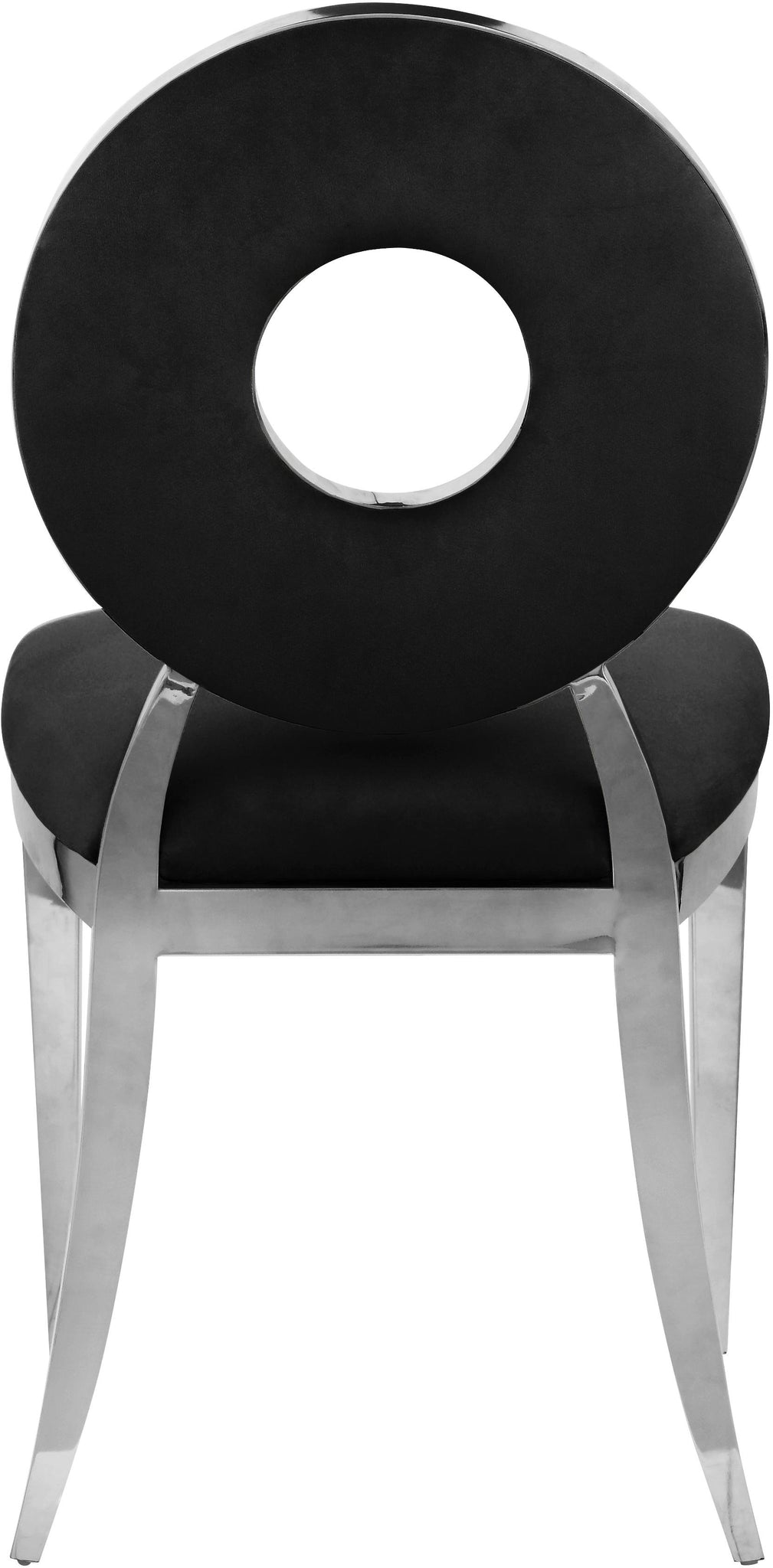 Yield to the decorator within when you bring home this Carousel velvet dining chair. This chair features a metal frame and legs finished in gold stainless steel for a modern touch, but the real star of the show is the donut-shaped seat back that exudes undeniable contemporary charm. The seat and back are both plumply filled for comfort and upholstered in soft black velvet for a chic look.