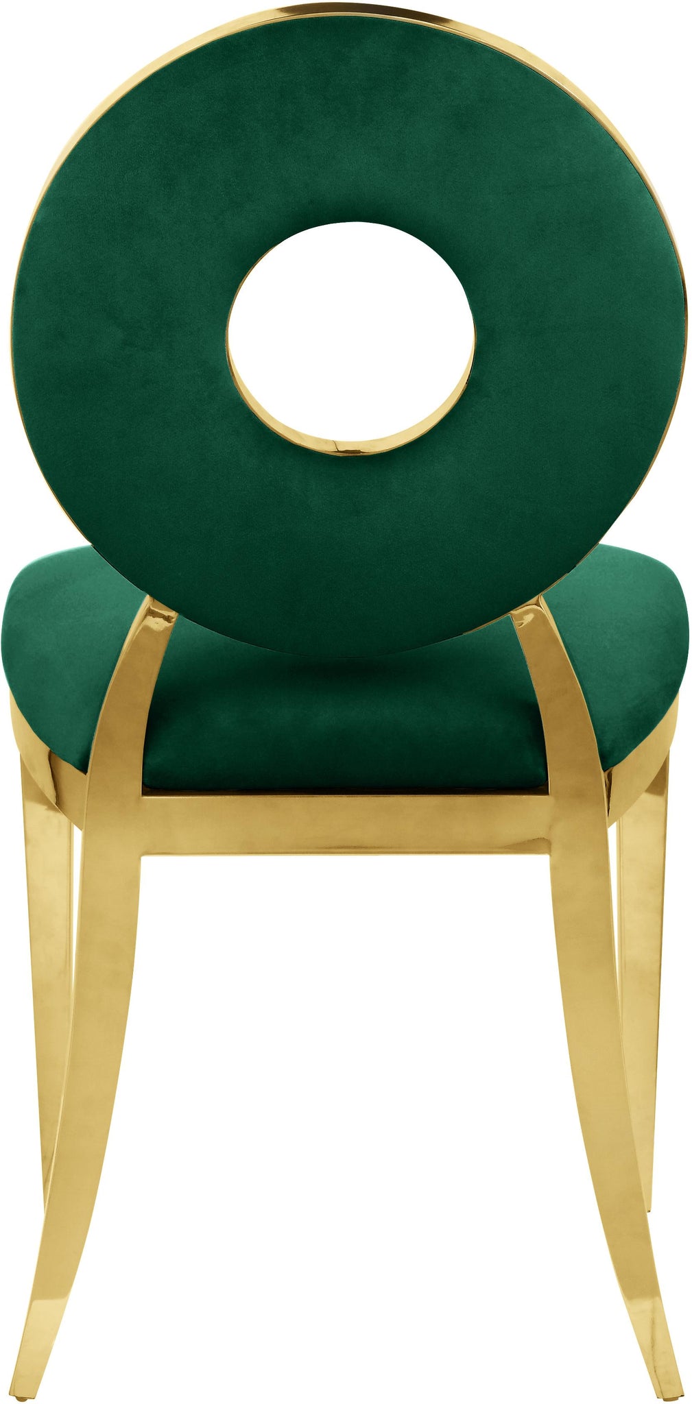 Yield to the decorator within when you bring home this Carousel velvet dining chair. This chair features a metal frame and legs finished in gold stainless steel for a modern touch, but the real star of the show is the donut-shaped seat back that exudes undeniable contemporary charm. The seat and back are both plumply filled for comfort and upholstered in soft green velvet for a chic look.