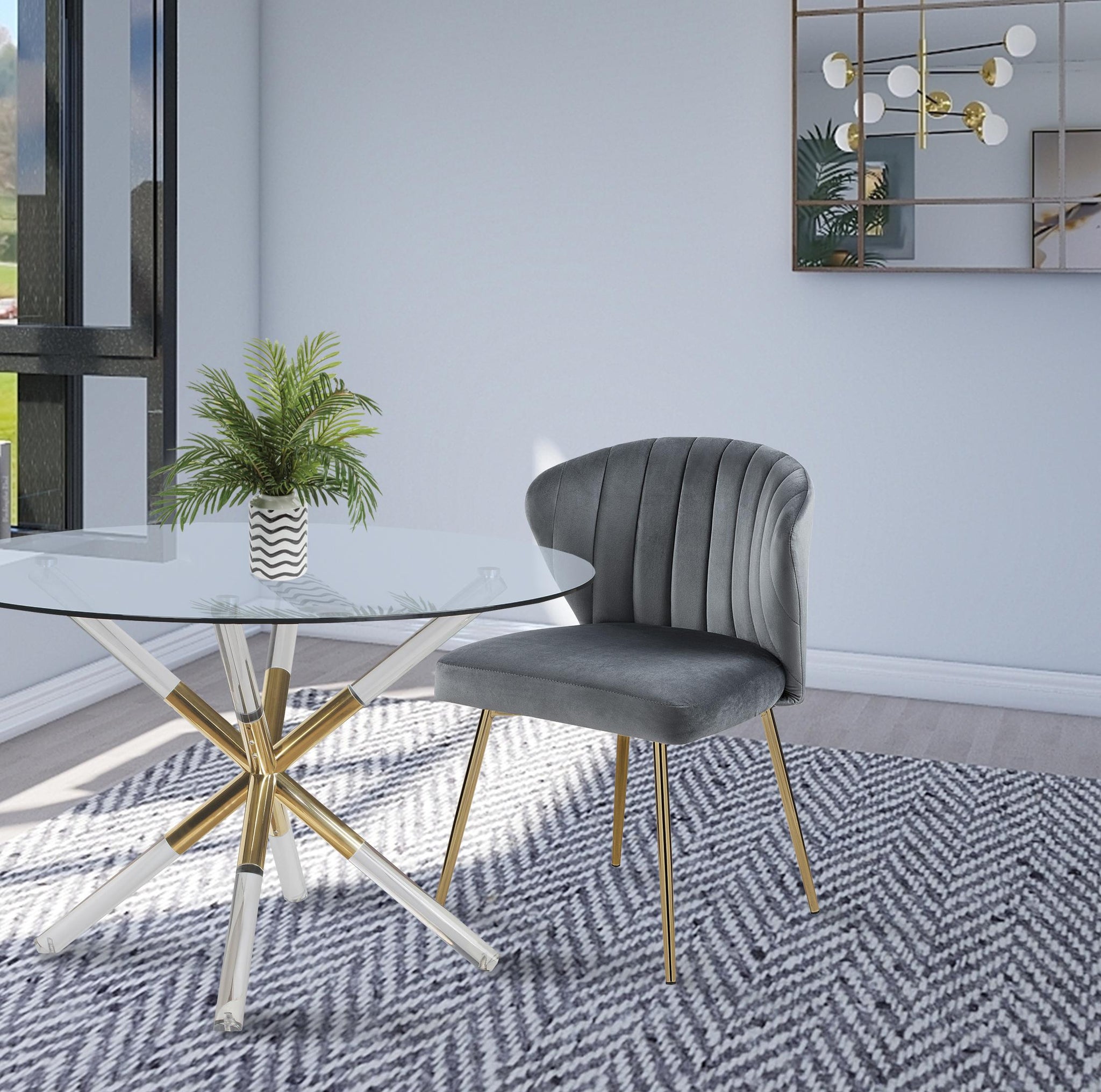 This Finley velvet chair, with its all-over soft grey velvet upholstery, offers elegance and sophistication for your dining room. Designed to elevate your room���s d?�cor in an instant, this seat oozes refinement and beauty with its curved and channel-tufted back and rich gold metal legs. Pair this lovely Finley chair with your favorite contemporary dining table for a seamless presentation.
