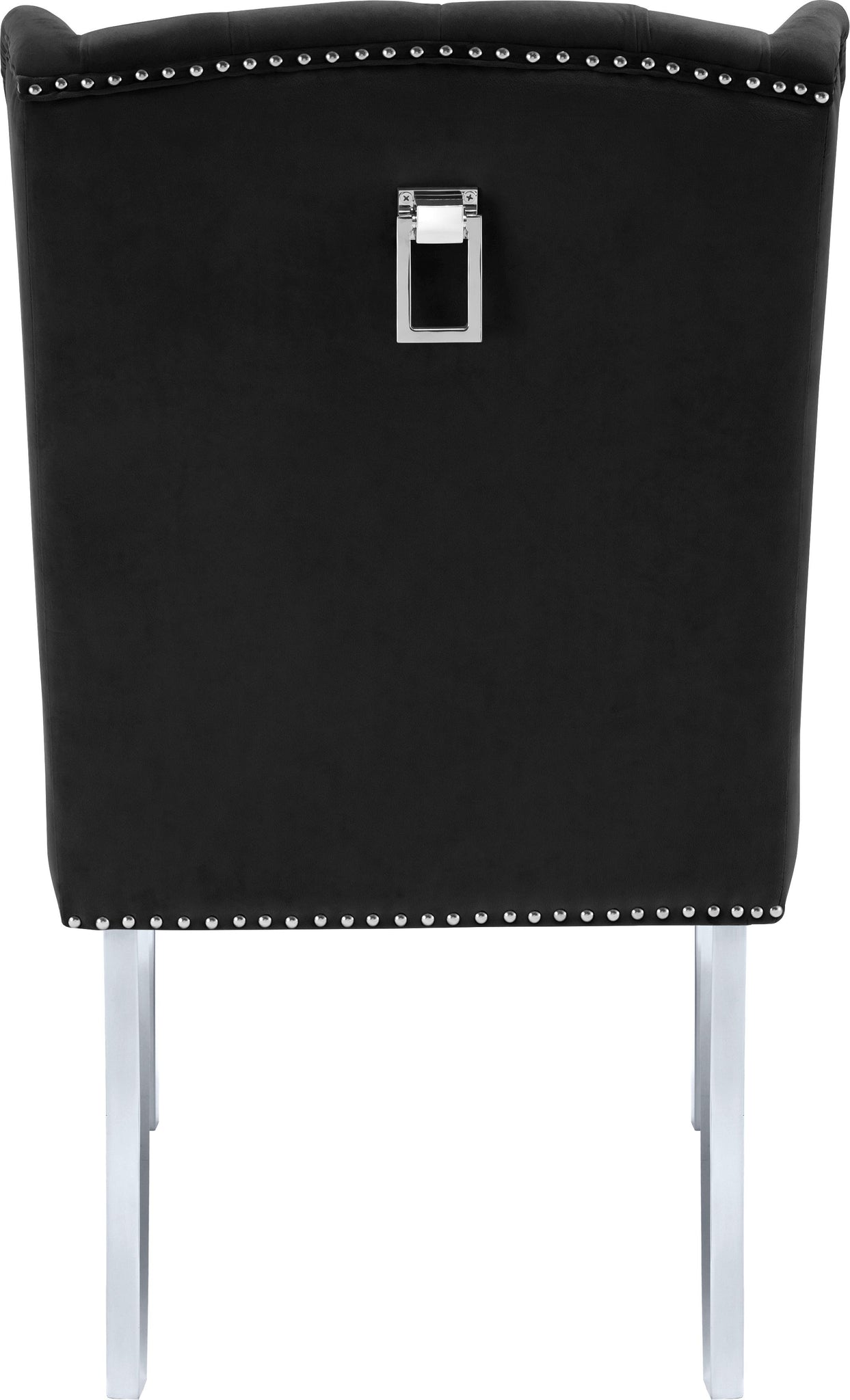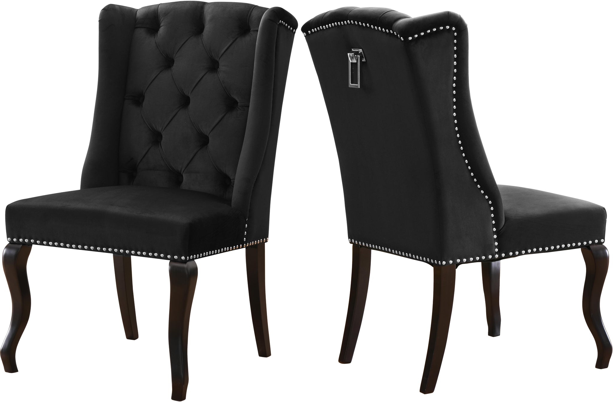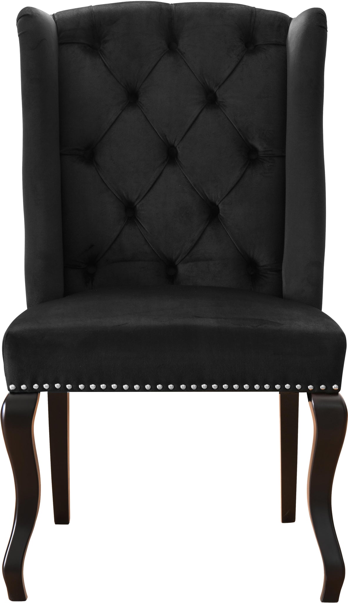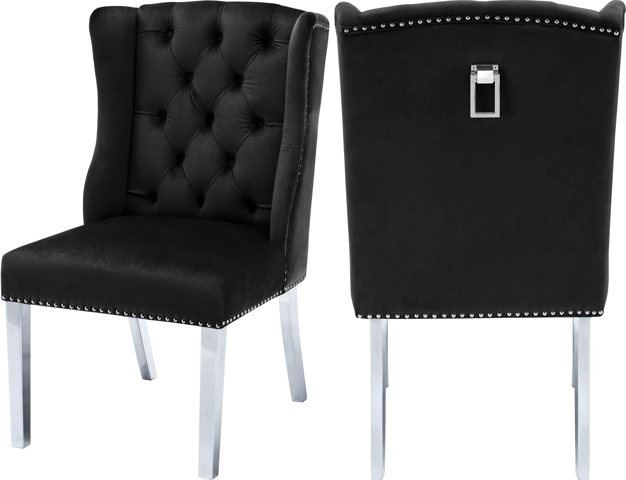 Bring luxury to mealtime with the Suri Black Velvet Dining Chair. This chair has a curvy, high back with an elegant look that blends modern with traditional. The back is tufted to prevent shifting of the padded cushion, and the chair has chrome nail head trim for added beauty and resilience. A chair knocker on the back lends an extra element of elegance to the design, and the wooden legs provide sturdy support and complete the design on a timeless note.