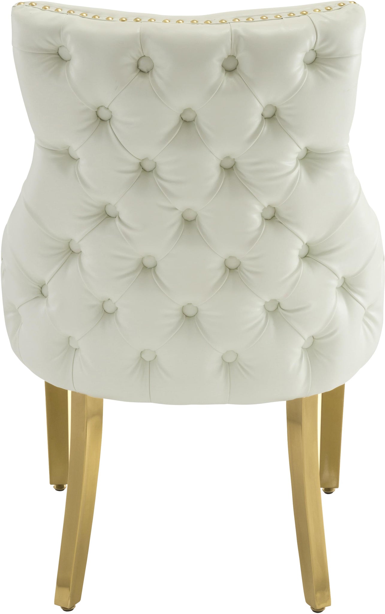 The Tuft faux leather dining chair is a true showstopper from every angle, making it a shoe-in among dinner guests. Rich and luxurious white faux leather upholstery lends this handsome chair a luxe feel, while nail head trim and button tufting details ensure its role as an aesthetic element in your space. Gold stainless steel legs provide the support necessary for long-lasting durability.