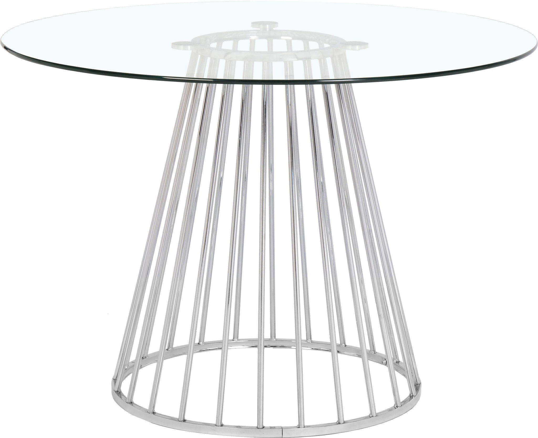 Add a bold touch to your dining area with this chic Gio dining table. Featuring a round, clear tempered glass tabletop and a polished chrome metal base with a wired contemporary design, this dining table transforms your dining space into a stylish haven. At 48 inches round and 30 inches high, this stunning table offers ample space for you to gather around and enjoy a family meal, while adding drama to your existing modern decor.