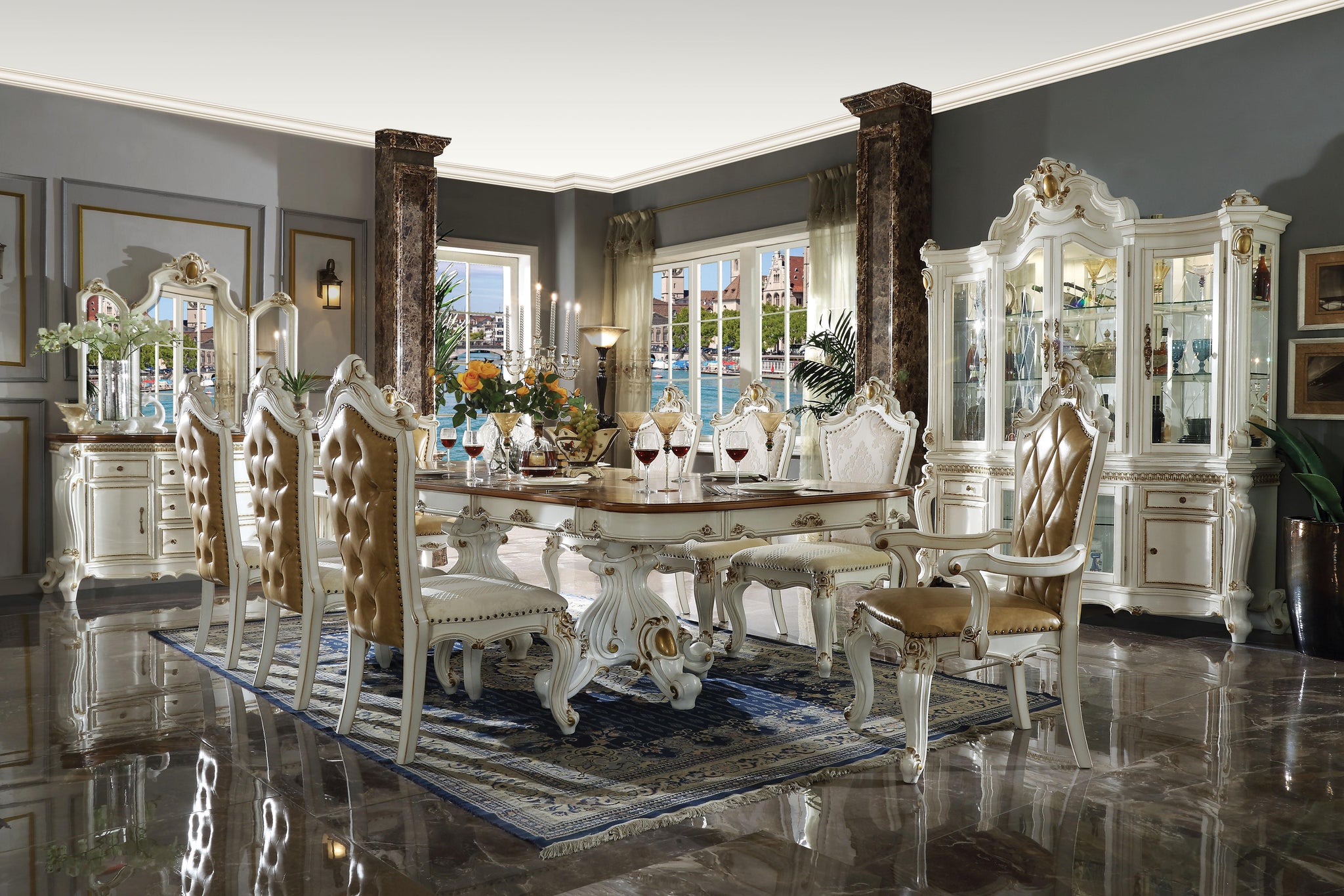 ACME Picardy Dining Table w/Double Pedestal, Antique Pearl & Cherry Oak (1Set/3Ctn), 49"W x 84" ~ 120"L (Includes 2 x 18" Leaves), 270lbs. Inspire your home and create an upscale atmosphere with the Picardy dining room collection. This dining table adds classic style to any sitting area featuring a traditional handcrafted design. The dual pedestal table features ornate feet, an intricately carved table edge, and two 18-inch leaf for hosting extra guests. Features: - Rectangular Double Pedestal Table - Wooden Top (2 x 18" Extension) - Raised Scrolled & Floral Motifs - Padded Seat & Back: Fabric & PU Cushion - Button Tufted (Outside Backrest) - Nailhead Trim - Matching Hutch & Buffet: Touch Light - Buffet Drawer: GLIDE Side Metal (Full Ext.), DOVETAIL English, Felt Lined - Collection Picardy Materials: Wood, Poly-Resin