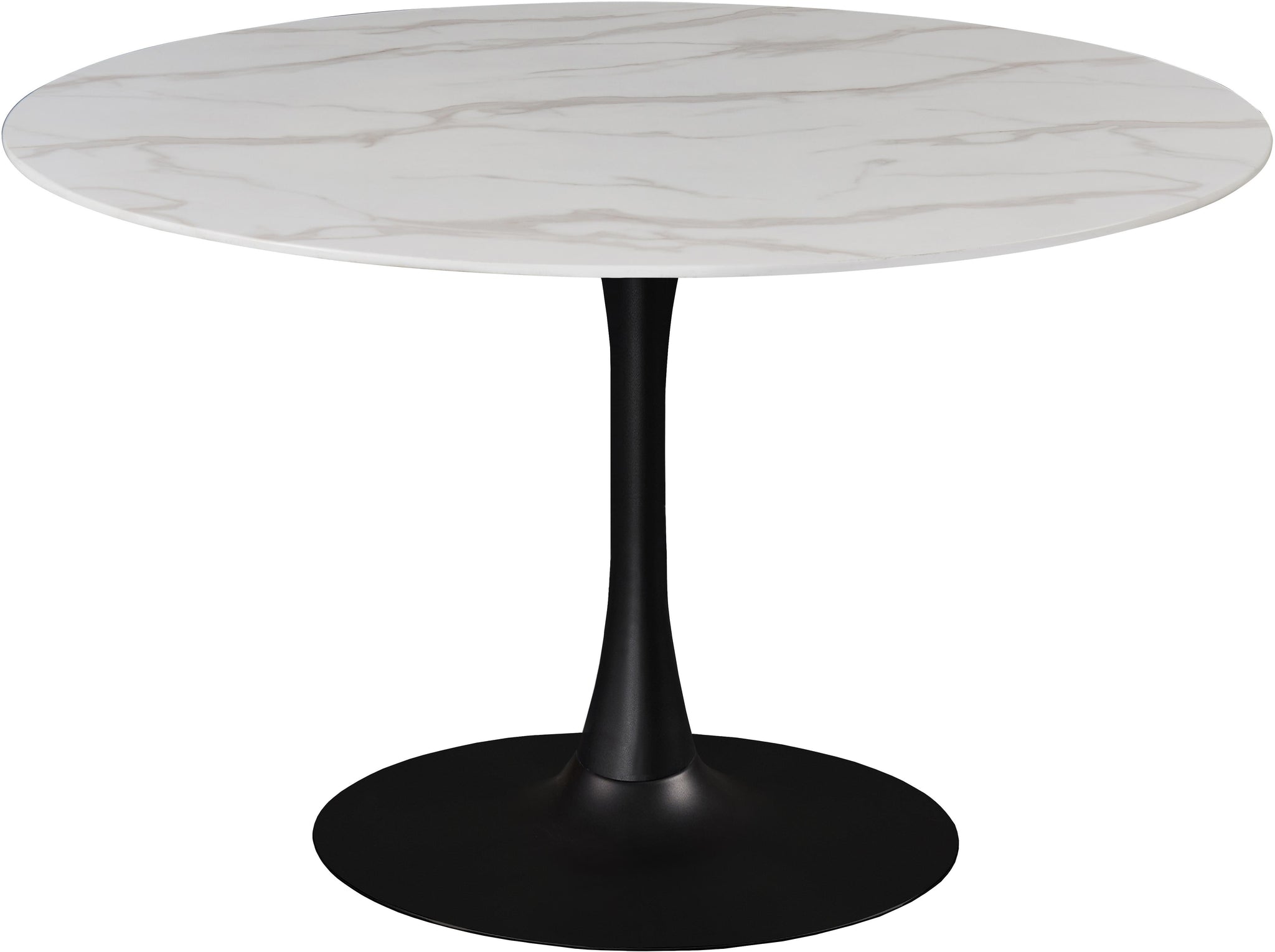 Add the Tulip 48" dining table to your kitchen, den or office to enjoy its petite size and elegant lines. The tabletop is made of 10MM thick glass with a glamorous marble veneer. A rich matte black pedestal base adds to the appeal of this gorgeous piece, and lets it fit into smaller spaces comfortably. Choose from a wide array of available matching chair styles to complete your contemporary style d?�cor.