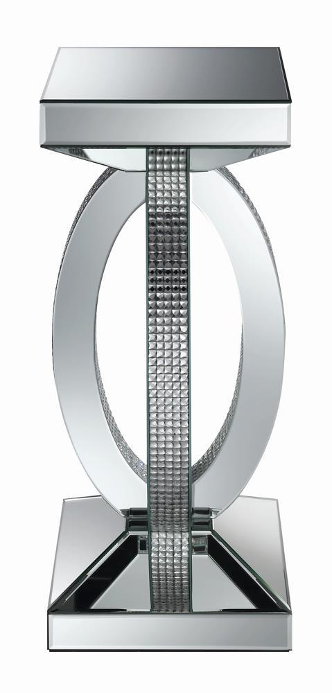 This chic and contemporary end table captivates with its sculptural, artistic design. Crafted with mirrored surfaces and engineered wood, it exudes modern luxury. The intersecting oval-shaped loops form a striking, three-dimensional silhouette, enhanced by sparkling rhinestone accents. A sturdy square base and tapered top complete the bold aesthetic, making it a glamorous centerpiece for any contemporary living space.
