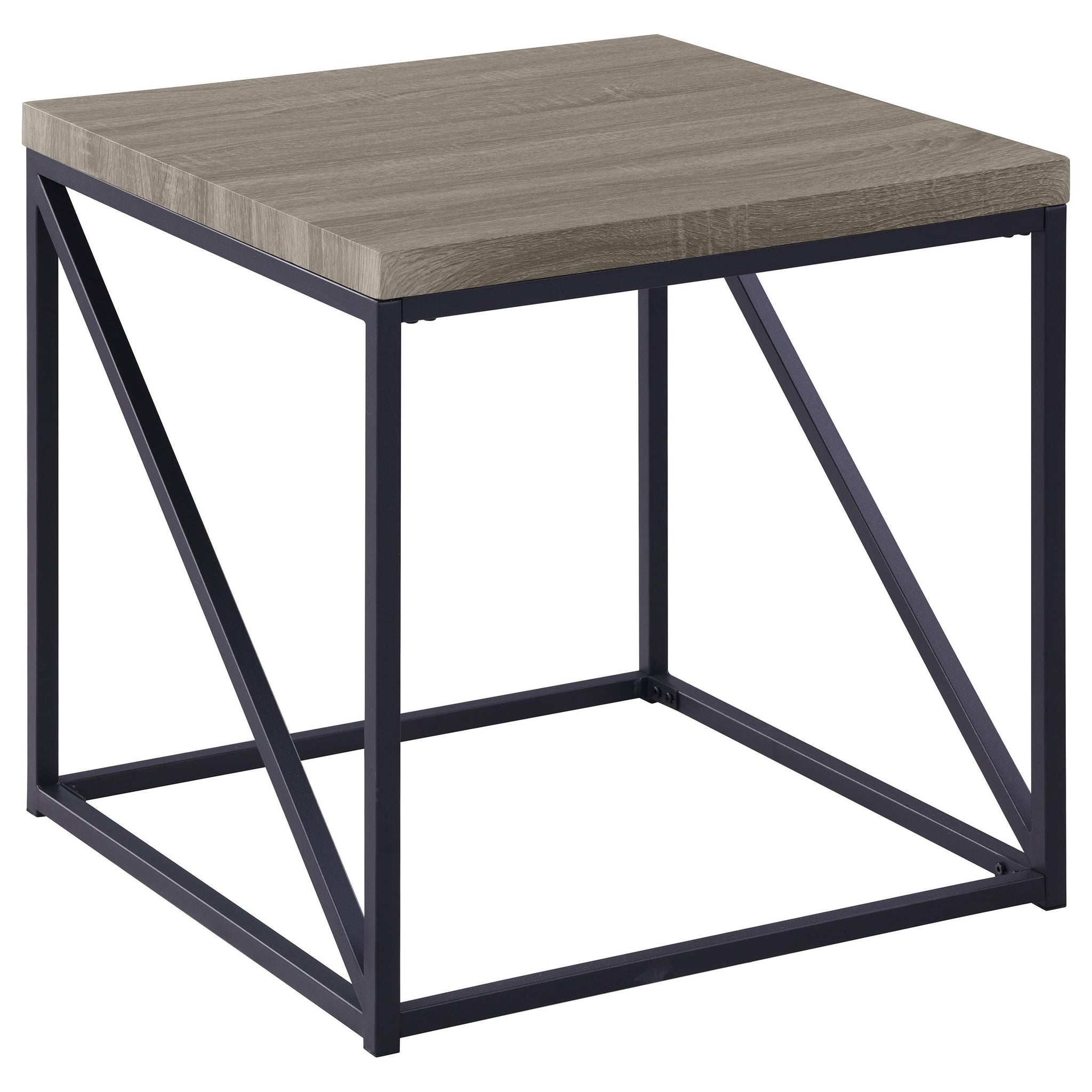 Upgrade your living space with this contemporary end table, combining functionality and style. The engineered wood top features a scratch-resistant laminate veneer in a sonoma grey finish for a wood-like appearance and lasting durability. Supported by a black powder-coated metal frame, this side table provides stability and industrial charm. Compact and versatile, it fits effortlessly next to sofas, chairs, or beds, making it a practical addition to any room.