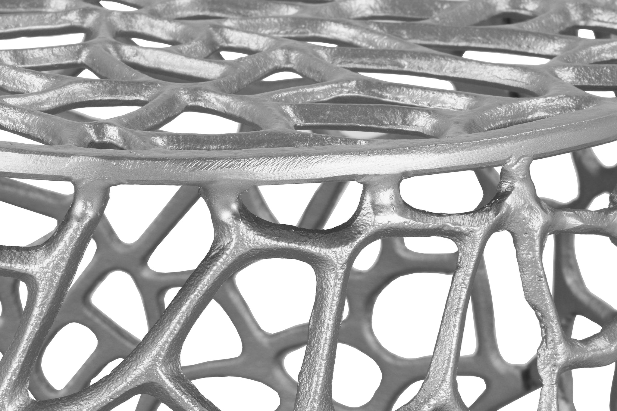 Give your space that added wow factor with this handsomely modern Priya end table. This contemporary table is made from solid aluminum for a lasting, durable build that holds up to years of use. The strikingly intricate detailed scrollwork and attractive silver finish gives it a sleek and modish vibe that is well at home in your living room or den. Pair it with the coordinating coffee table for a coordinated look in your room.
