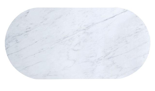 KOBLENZ Coffee Table, Dark Walnut, 48"L X 24"W X 18"H, 70.2lbs. Posh and chic, these rounded tables are reminiscent of the bygone era of Hollywood stars. Infused with Art Deco inspiration, each piece features matte gold frames that hold up the top and bottom shelves. The top is made of faux marble in a glorious white shade with subtle variations in color. The sides add texture to an otherwise sterile piece--reeded panels curve around the corners and conceal a storage drawer for a slick, contemporary look.