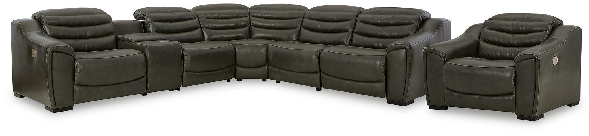 For those seeking to curate a living room retreat that offers superior comfort and a contemporary aesthetic, this sleekly designed power reclining package will become your favorite source of at-home serenity. Rest on real leather in spacious seating areas while using one-touch power controls to recline and adjust the headrests with ease. As you recharge after a long day, your devices can too with USB charging. This set is visually enticing in a luxe dark gray, with slope track arms and stitched detailing on the back to enhance its modern appeal.