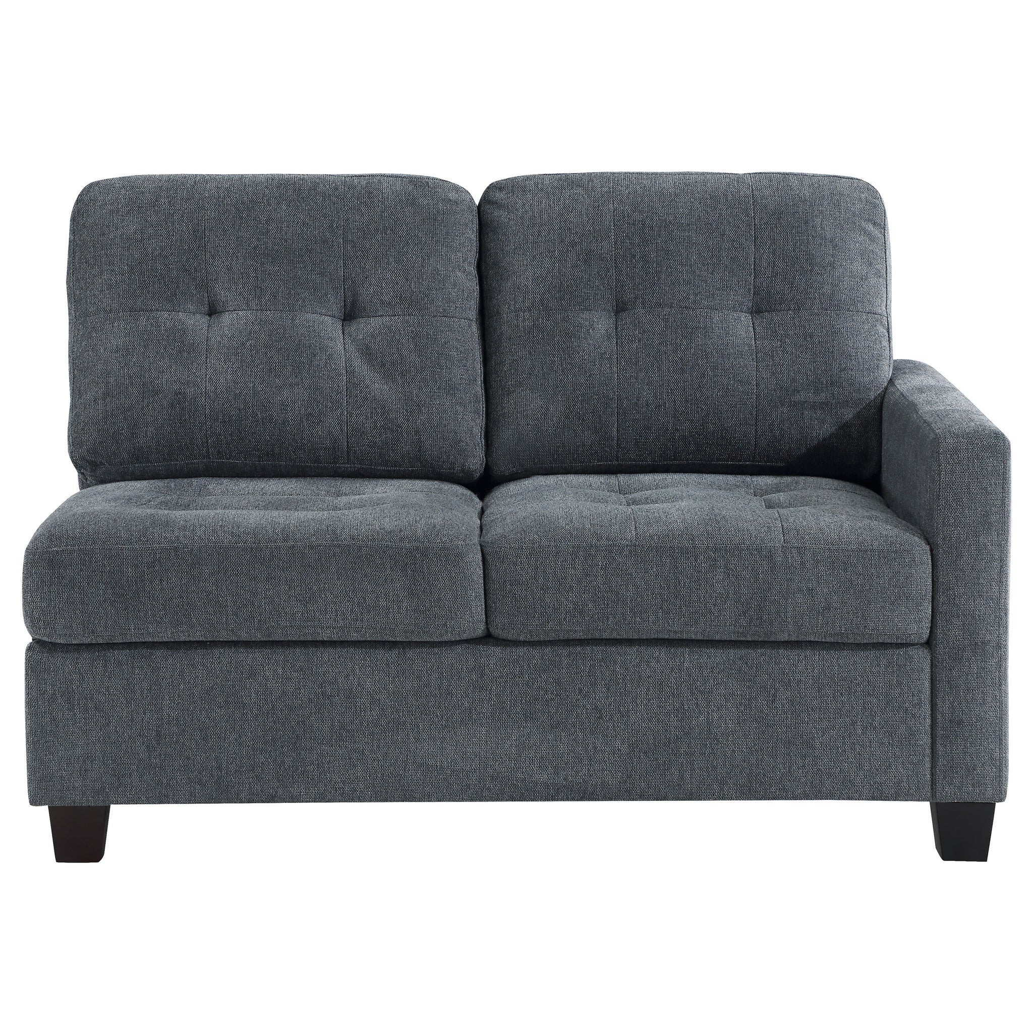 Complete your sectional setup with this right arm facing (RAF) loveseat, designed to add both style and functionality to your living space. The loveseat is upholstered in a refined fabric that pairs well with a variety of decor styles, making it a versatile addition to your home. Foam-padded cushions offer plush comfort, while the sturdy wood frame ensures durability and support. The right armrest design is perfect for creating a finished look in your sectional arrangement. Subtle tufting on the back cushion and chunky wood feet contribute to the chair’s timeless design, making it a stylish and comfortable choice for any room.