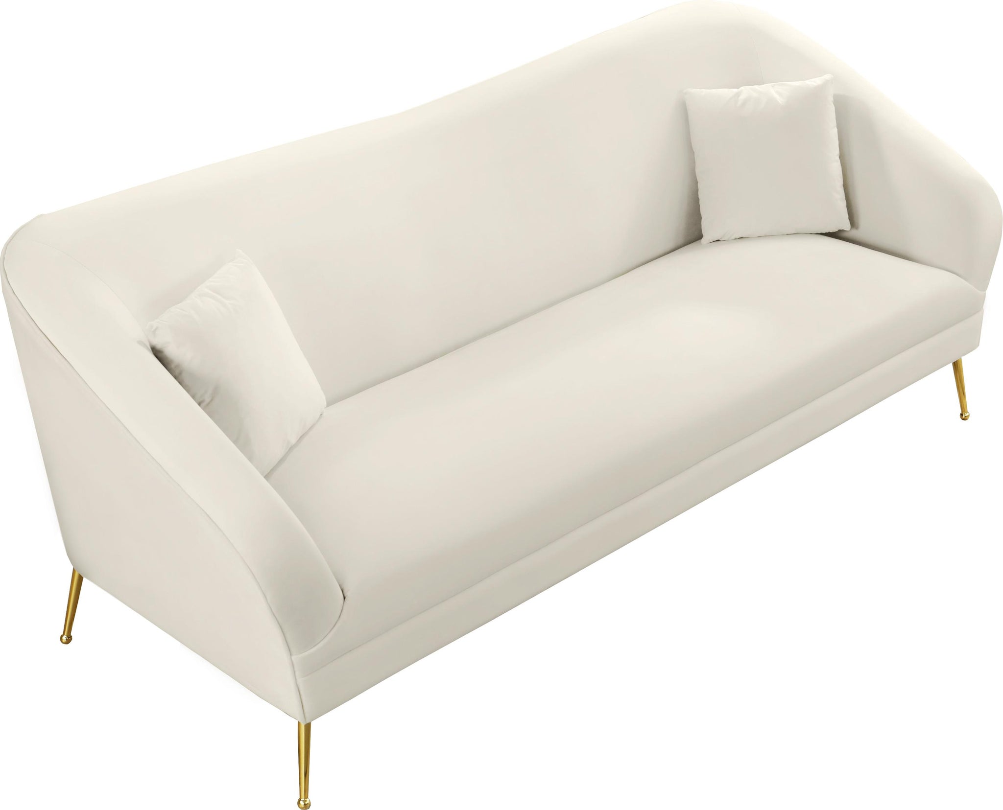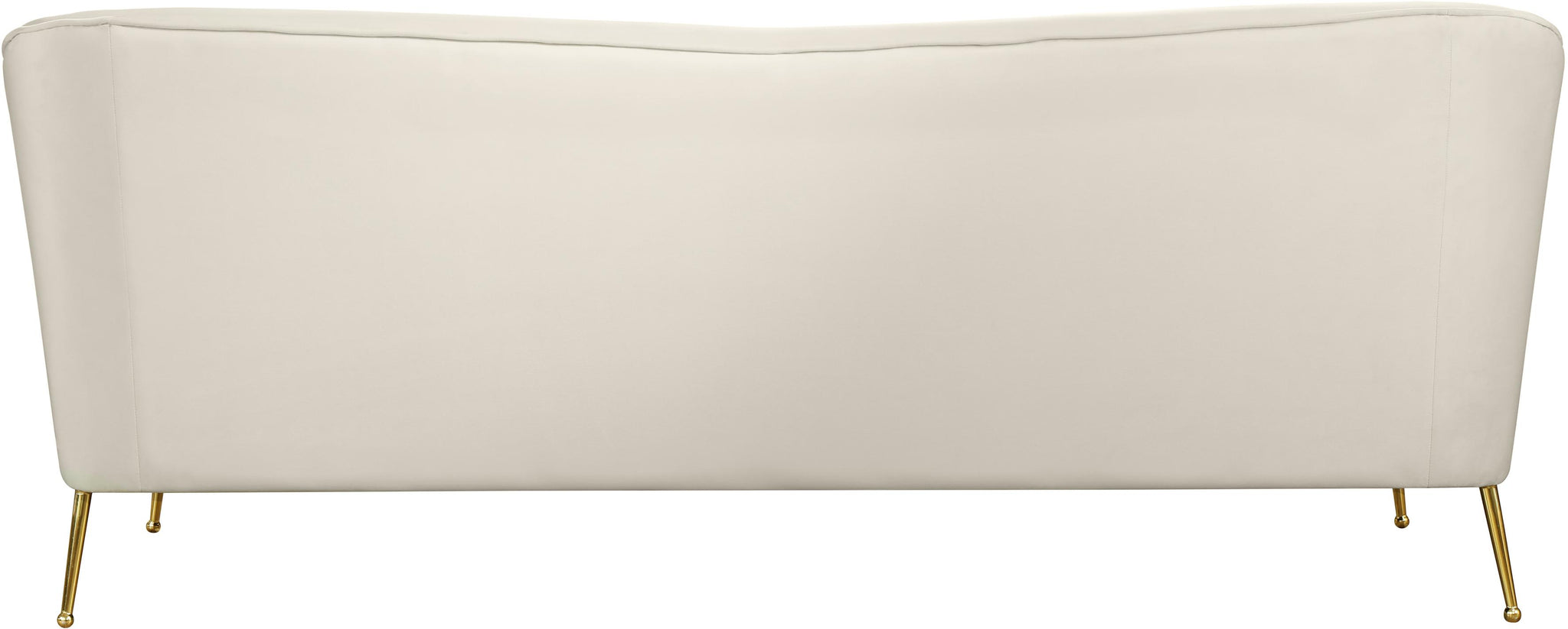 Create instant drama in your room with this Hermosa Velvet Sofa by Meridian Furniture. The mid-century design makes the sofa a true standout among other furnishings, with its sleek curved back and arms that create an aesthetically pleasing silhouette. The soft cream velvet upholstery feels sleek and sumptuous to the skin and gives your room an upscale look. Gold legs finish off the design, each of them with a ball design on the foot for added sophistication.