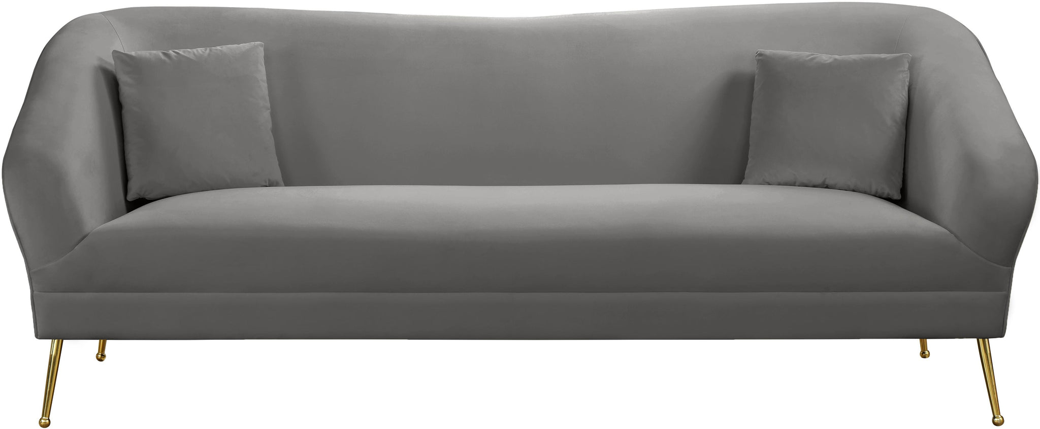 Create instant drama in your room with this Hermosa Velvet Sofa by Meridian Furniture. The mid-century design makes the sofa a true standout among other furnishings, with its sleek curved back and arms that create an aesthetically pleasing silhouette. The soft grey velvet upholstery feels sleek and sumptuous to the skin and gives your room an upscale look. Gold legs finish off the design, each of them with a ball design on the foot for added sophistication.