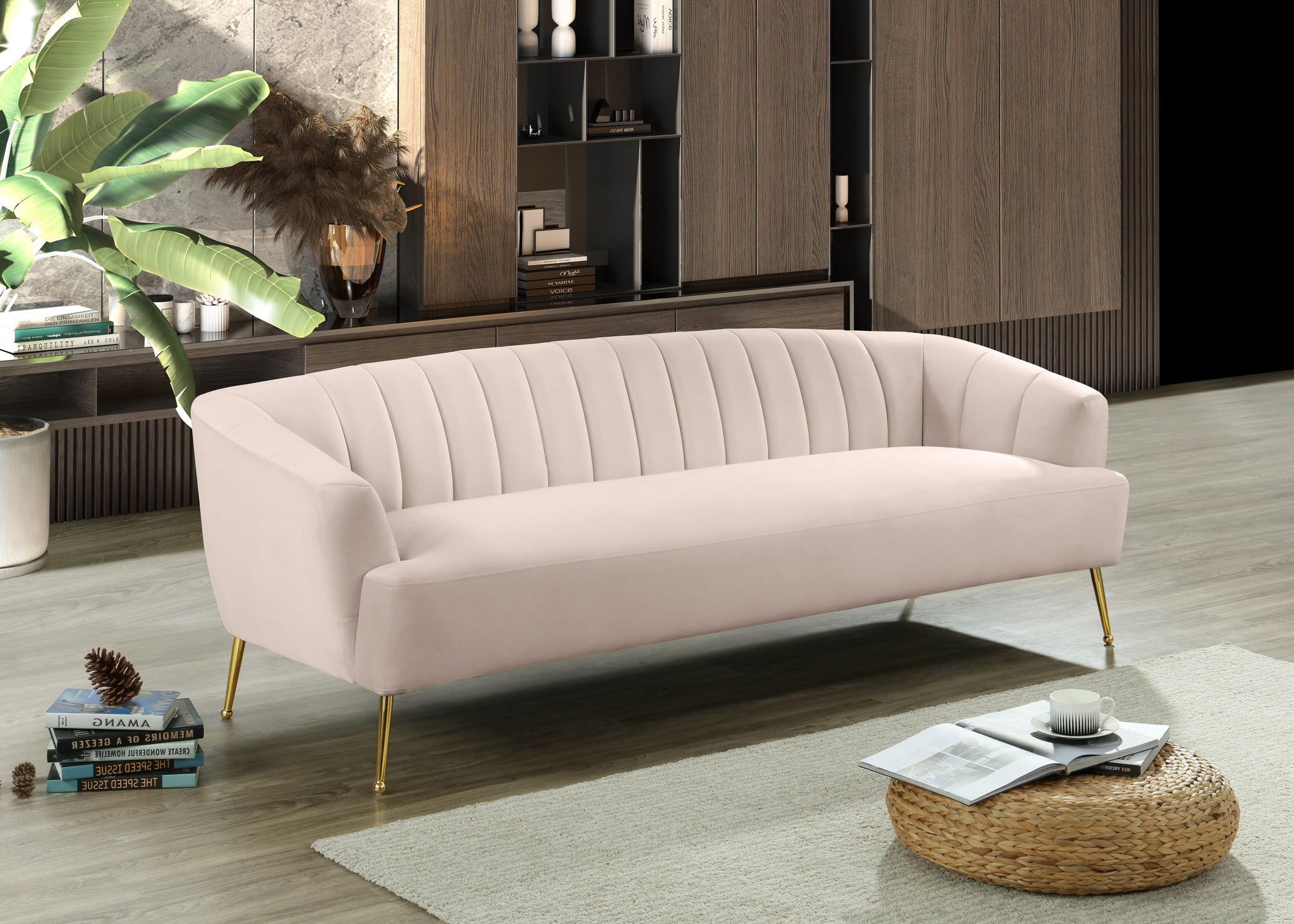 Dress up your living room space with this Tori Velvet Sofa. This plush sofa features fun pink velvet upholstery that covers every square inch, adding a sumptuous and svelte look to your room. The gold legs with a ball design on the foot adds to the elegant look of this pretty chair, and deep channel tufting adds loft to the back and arms for a lavish feel when you sit down to relax and unwind at day���s end.