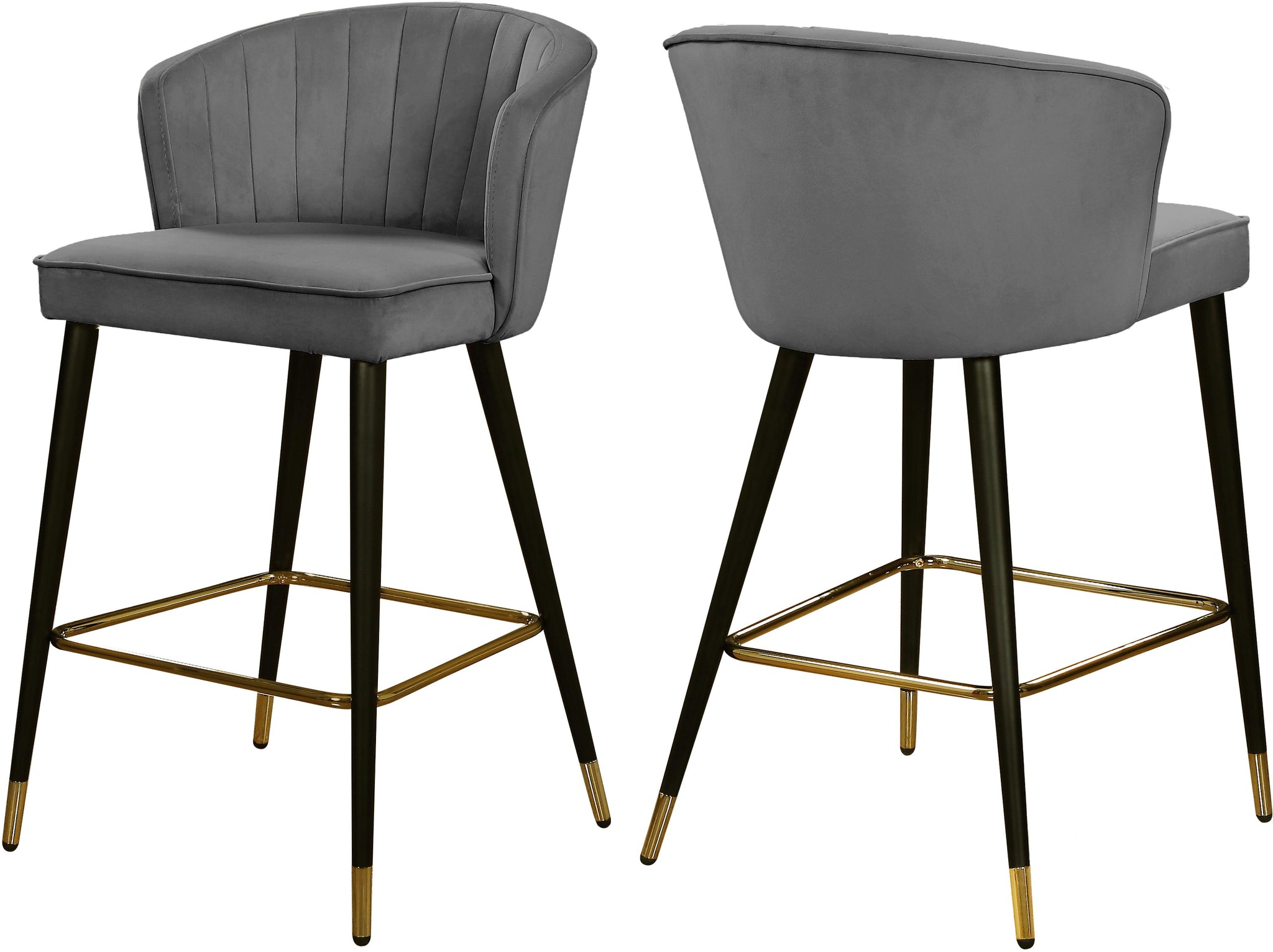 Give your kitchen counter or home bar a fresh new look with this Cassie Grey Velvet Stool. The shell-shaped back and channel tufted design draw the eye, making this stool an attention-commanding addition to your space. The sleek black metal legs flare slightly to create a modish silhouette, while goldtone tips on the ends and a goldtone foot rail complete the look. Rich velvet in a neutral hue makes it easy to blend this stool in easily with any color scheme.
