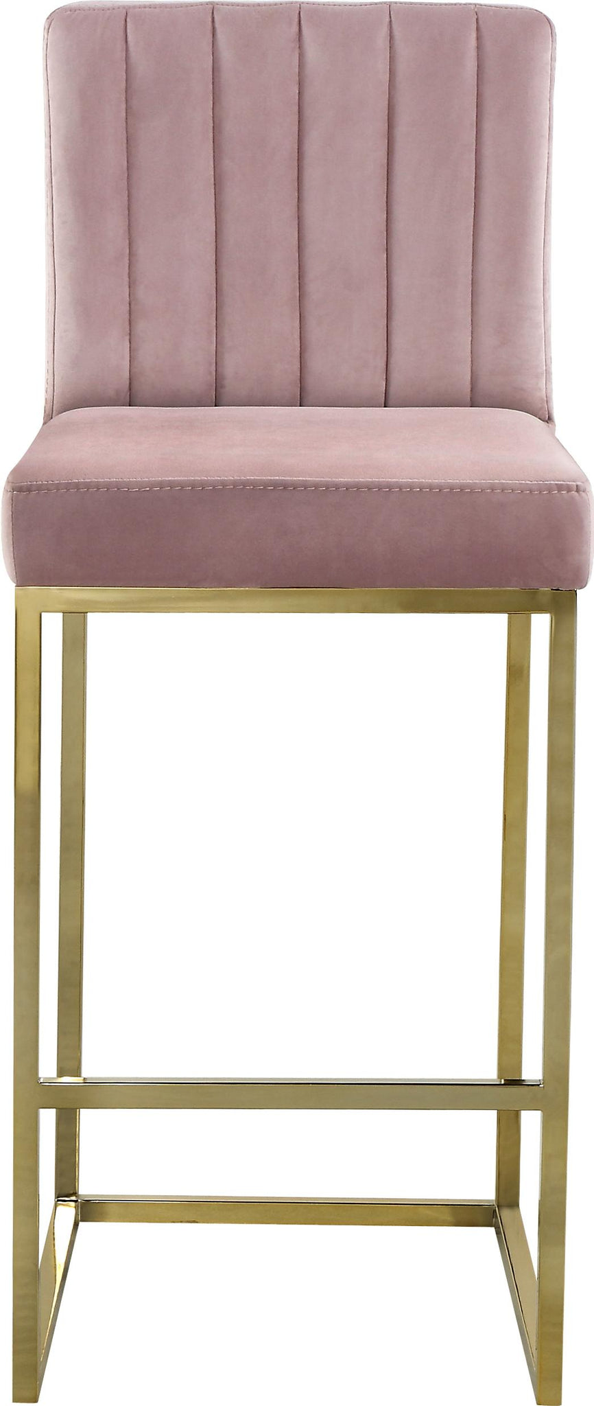 Outfit your home bar or kitchen counter with this Giselle Pink Velvet Stool. The sleek pink color is perfectly suited to contemporary decor and fits well with other neutral-colored furnishings for easy integration in your room, and the velvet upholstery is sleek and comforting to the touch and the skin. A gold finish on the metal frame adds to the modern panache of this stool, while a footrail along the front ensures you have a spot to rest your feet while you enjoy pancakes at the counter or a cocktail at the bar.
