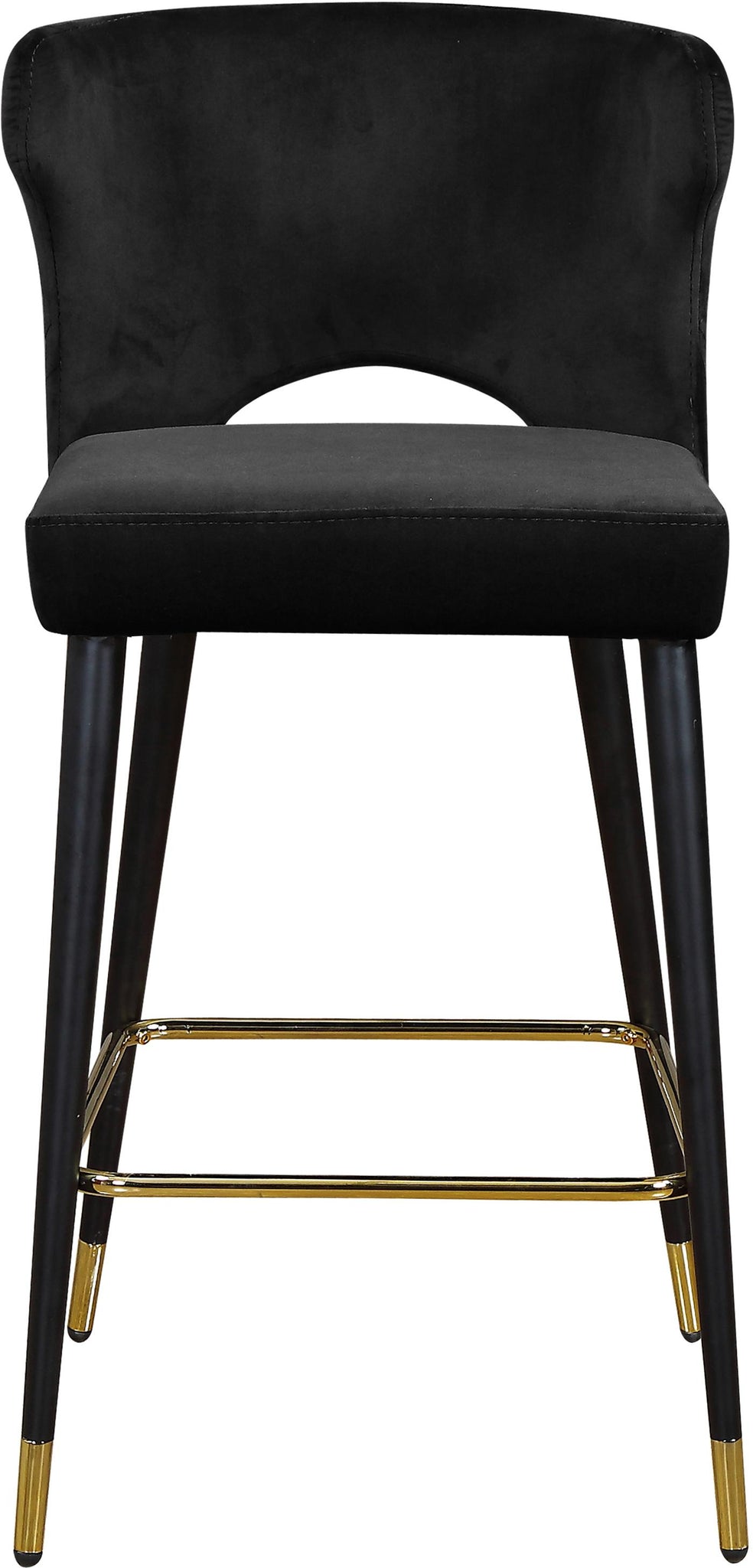 Sit comfortably on this Kelly Black Velvet Stool. The back and seat cushions are plumply stuffed for enhanced comfort and covered in rich velvet upholstery to give your room a burst of color and jewel-toned fun. This stool has black metal legs with gold tips for added contemporary panache, and it's built strong and tough, so it stands up to heavy daily use without breaking a sweat. These stools can outfit any bar or kitchen counter area.