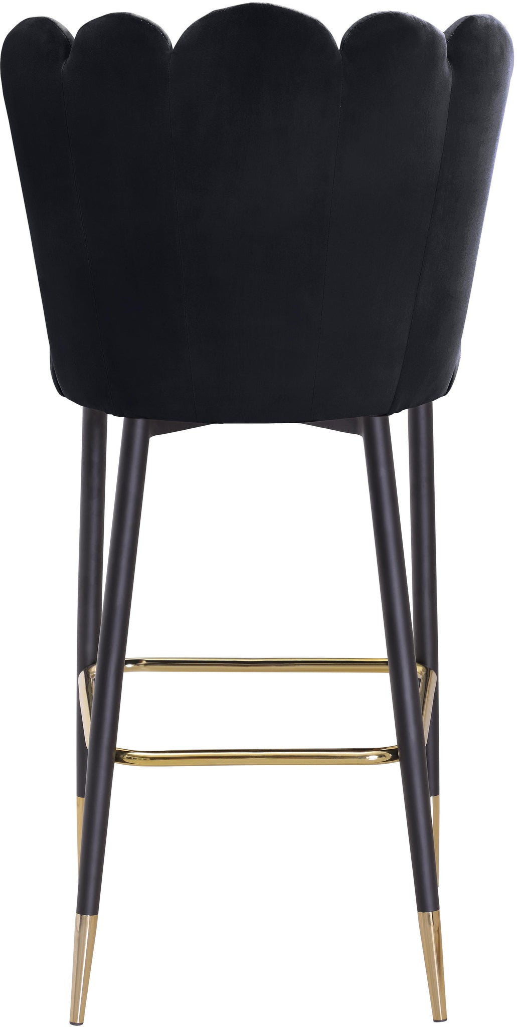 Fall fast and hard for the beautiful look of this Lily Bar Stool from Meridian Furniture. This lovely stool features a striking black velvet fan-style back with deep tufting that helps the padding inside stay full and aloft for added comfort. The cushioned seat and back are upholstered to the hilt for maximum luxury and beauty. Black metal legs with a matte finish and gold tips add contemporary appeal to this handsome stool whether used at the bar or kitchen counter.