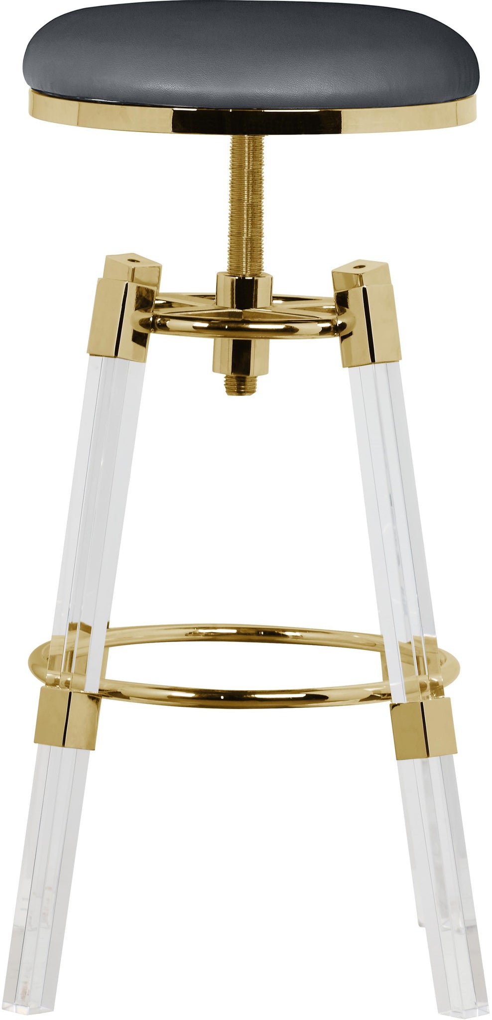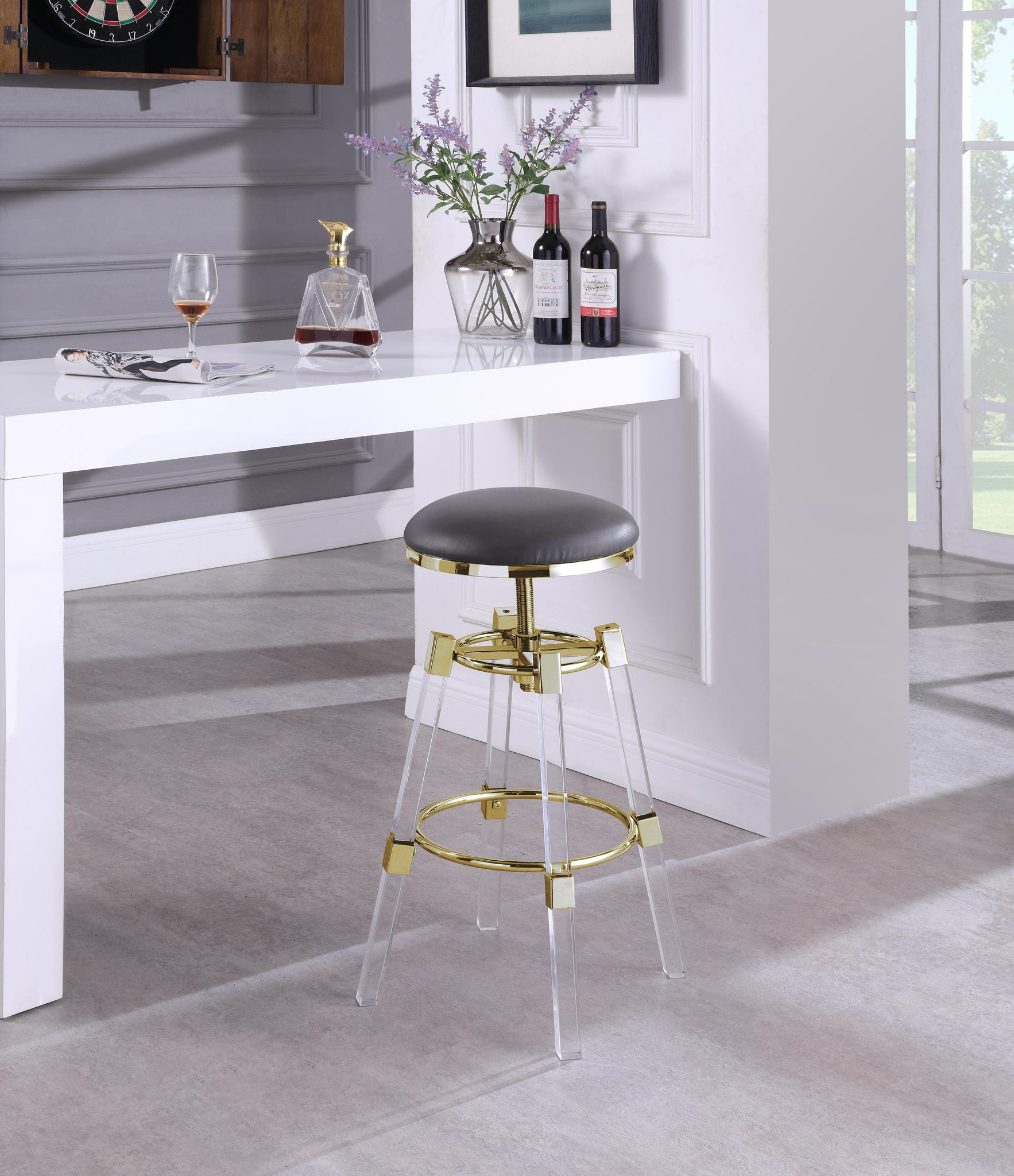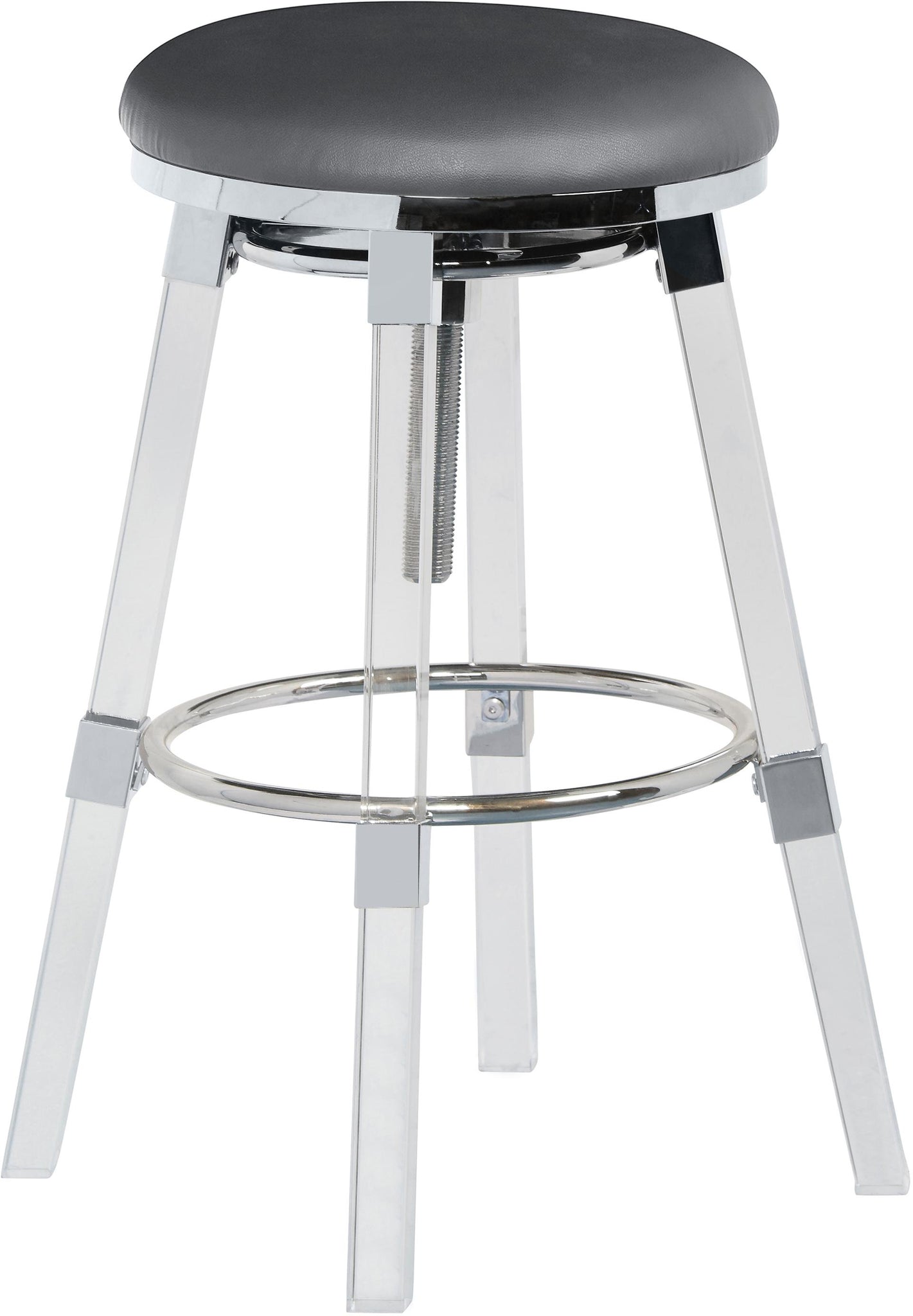 Make your kitchen counter the spot to be when you bring home this Venus Faux Leather Adjustable Bar and Counter Stool. This stool is modern through and through with its minimalist design and back-to-basics looks. The backless stool features a thick acrylic and chrome base that's super modish and sleek, and it's topped with a grey faux leather cushion for comfort as you wine or dine. Adjust the stool easily with the mechanism below the seat to make it counter or bar height as needed.
